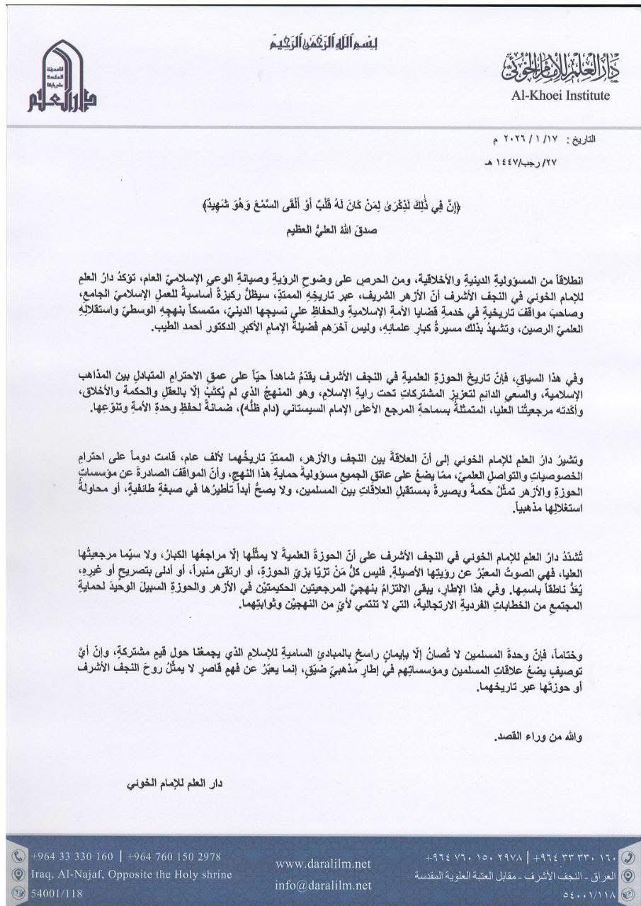 وقال بيان رسمي صادر عن دار العلم للإمام الخوئي بالنجف، تحت عنوان ﴿إِنَّ فِي ذَٰلِكَ لَذِكْرَىٰ لِمَن كَانَ لَهُ قَلْبٌ أَوْ أَلْقَى السَّمْعَ وَهُوَ شَهِيدٌ﴾، أنه انطلاقًا من المسؤولية الدينية والأخلاقية، ومن الحرص على وضوح الرؤية وصيانة الوعي الإسلامي العام، تؤكد دار العلم للإمام الخوئي في النجف الأشرف أن الأزهر الشريف، عبر تاريخه الممتد، سيظل ركيزةً أساسيةً للعمل الإسلامي الجامع، وصاحب إسهامٍ عميقٍ في خدمة قضايا الأمة الإسلامية، والحفاظ على نسيجها الديني، متمسكًا بنهجه الوسطي واستقلاله العلمي الرصين، وتشهد بذلك مسيرة كبار علمائه، وليس آخرهم فضيلة الإمام الأكبر الدكتور أحمد الطيب.