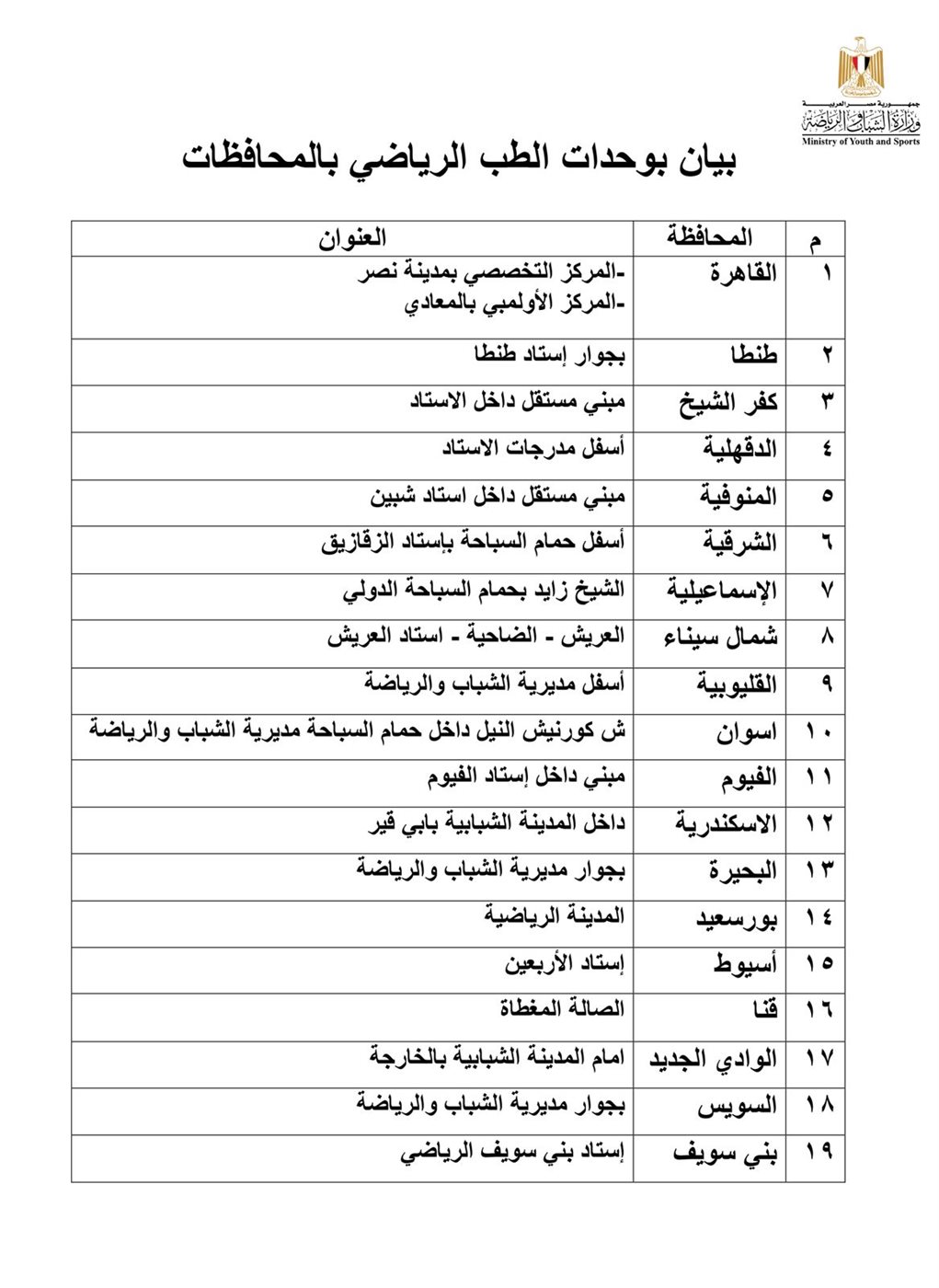 ويأتي ذلك في إطار تنظيم مشاركة الرياضيين في بطولات الجمهورية بمختلف المسابقات وفي كافة الألعاب الرياضية، ولمختلف الفئات العمرية، بما يضمن جاهزية اللاعبين طبيًا وفقًا للضوابط المعتمدة.