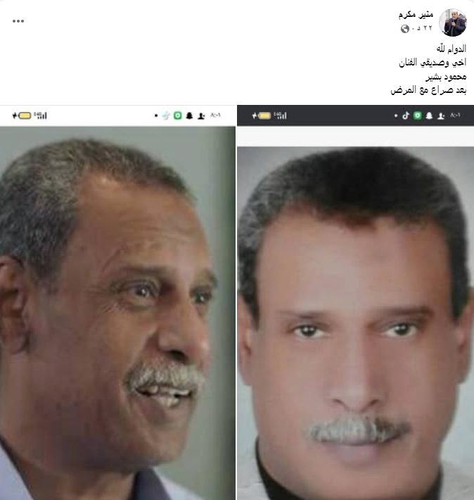 وقال “مكرم” على صفحته بـ"فيس بوك":" الدوام لله أخي وصديقي الفنان محمود بشير بعد صراع مع المرض".
