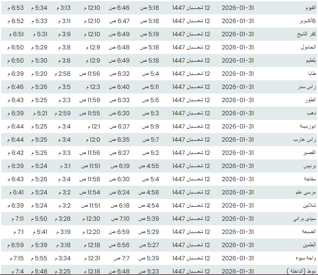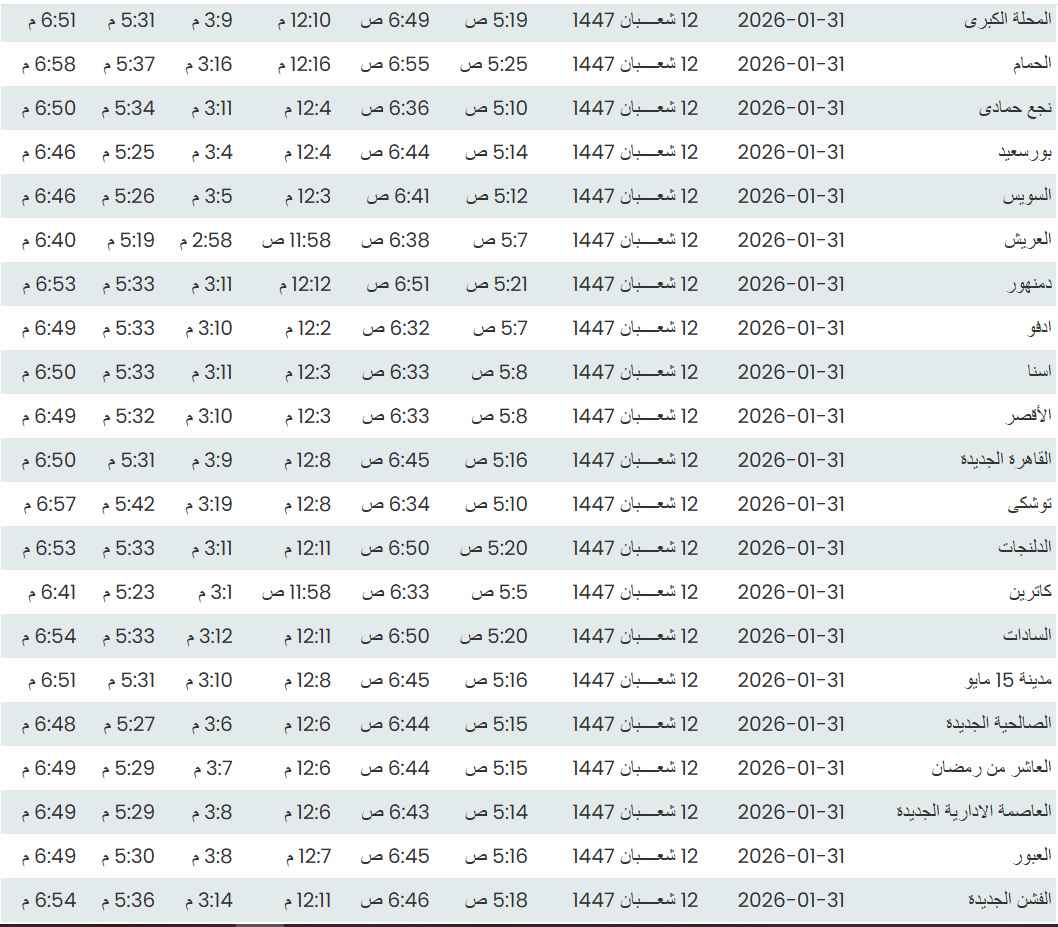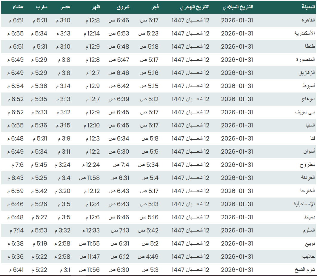 وفيما يلي مواقيت الصلاة، لعدد من مدن ومحافظات الجمهورية من واقع بيانات الهيئة العامة للمساحة