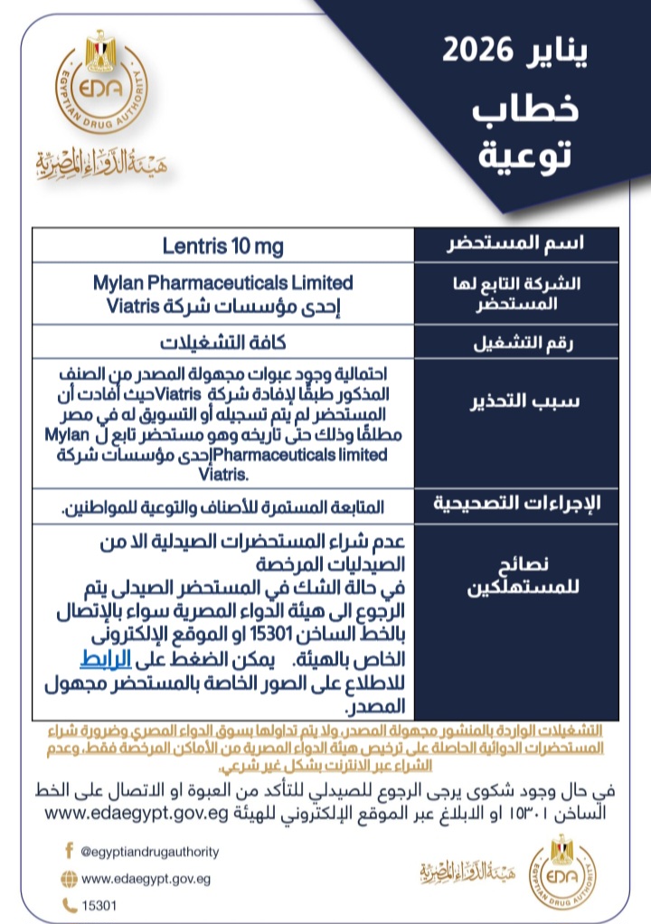 أصدرت هيئة الدواء المصرية خطاب توعية تحذيري بشأن احتمالية وجود عبوات مجهولة المصدر من مستحضر Lentris 10 mg.