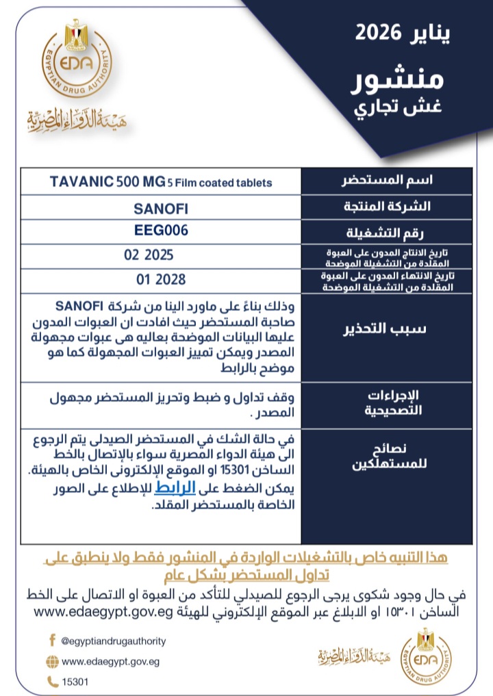 أصدرت هيئة الدواء المصرية، منشور غش تجاري تحذيري بشأن وجود عبوات مجهولة المصدر من مستحضر TAVANIC 500 MG.