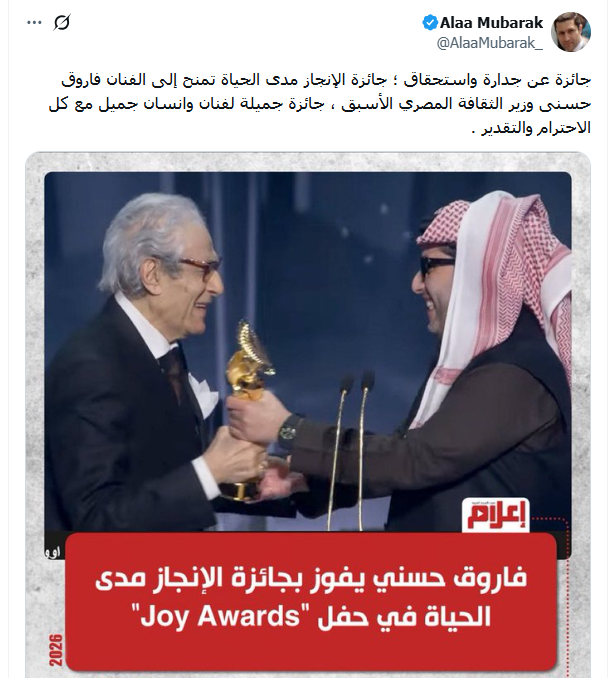 وتابع علاء مبارك رسالته لفاروق حسني فقال: "جائزة عن جدارة واستحقاق؛ جائزة الإنجاز مدى الحياة تمنح إلى الفنان فاروق حسنى وزير الثقافة المصري الأسبق، جائزة جميلة لفنان وإنسان جميل مع كل الاحترام والتقدير".