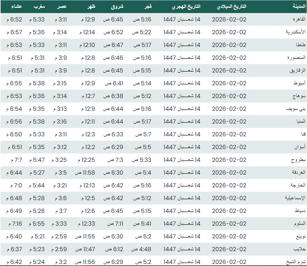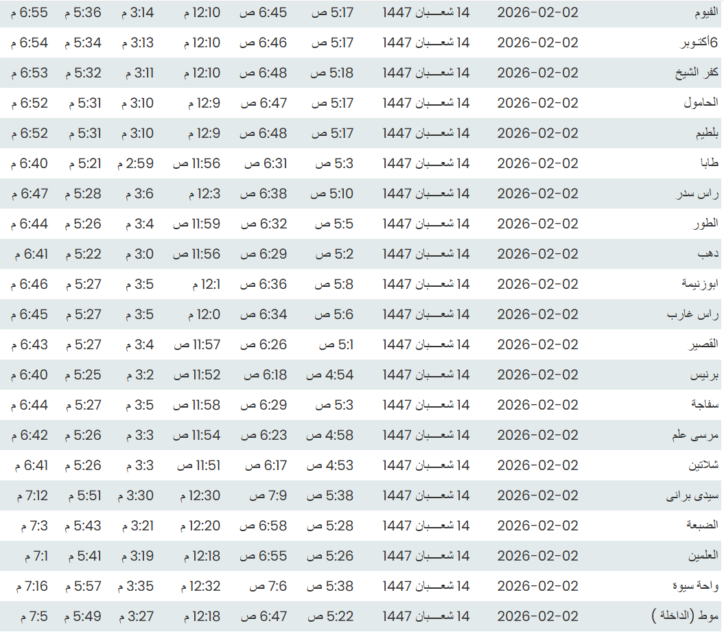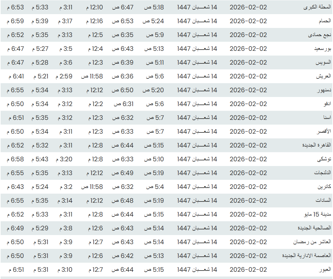 وفيما يلي مواقيت الصلاة، لعدد من مدن ومحافظات الجمهورية من واقع بيانات الهيئة العامة للمساحة