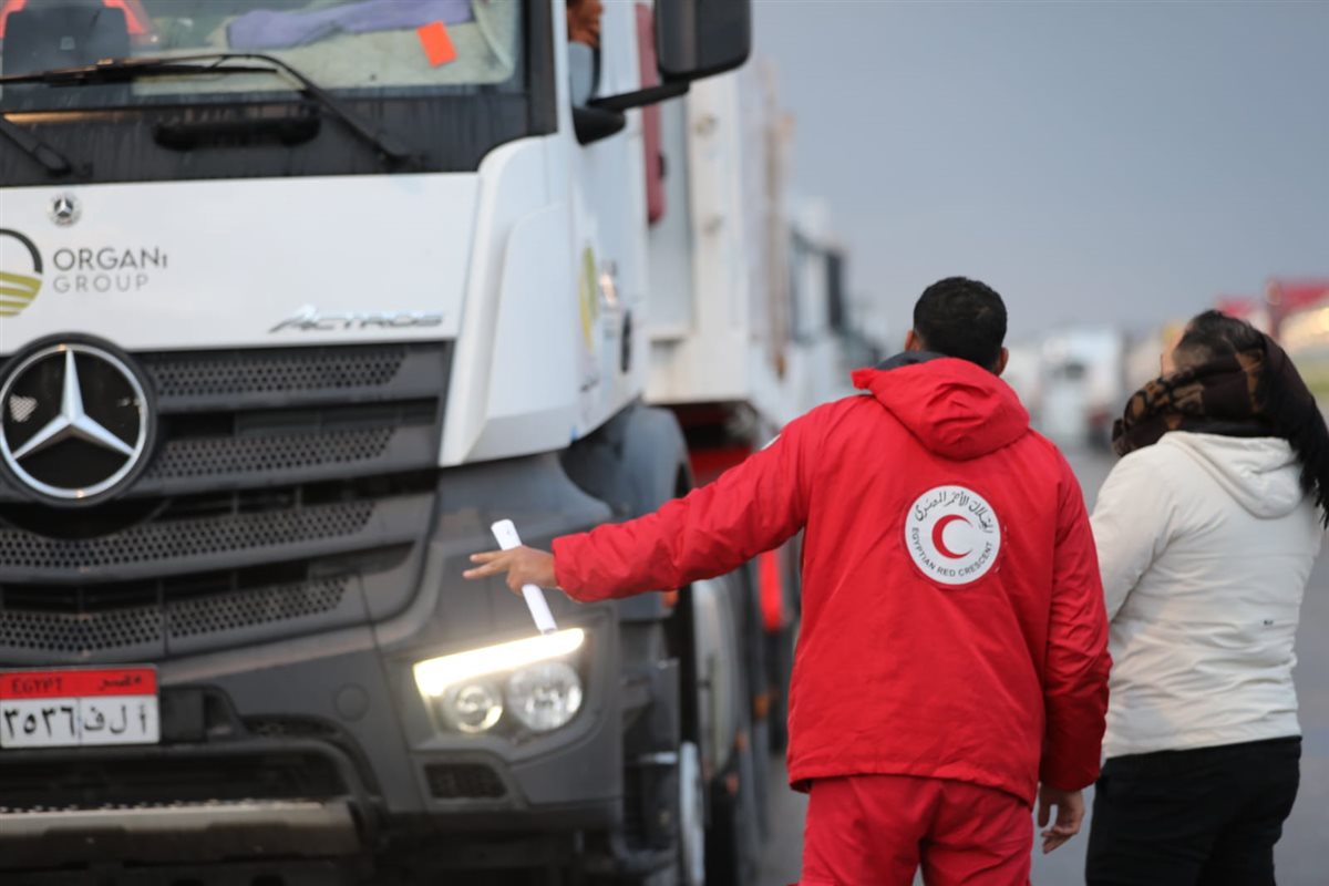 ويتواجد الهلال الأحمر المصري كآلية وطنية لتنسيق وتفويج المساعدات إلى غزة، على الحدود منذ بدء الأزمة حيث لم يتم غلق معبر رفح من الجانب المصري نهائيًا، وواصل تأهبه فى كافة المراكز اللوجستية وجهوده المتواصلة لدخول المساعدات التي بلغت أكثر من نصف مليون طن من المساعدات الإنسانية والإغاثة، وذلك بجهود 65 ألف متطوع بالجمعية.