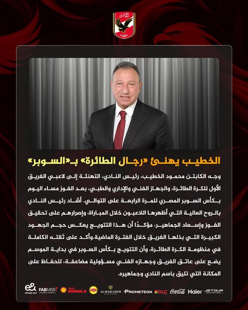 حرص الكابتن محمود الخطيب، رئيس النادي الأهلي، على تهنئة الفريق الأول لكرة الطائرة رجال بالنادي بعد التتويج ببطولة كأس السوبر المصري عقب الفوز على الزمالك بنتيجة 3-1.