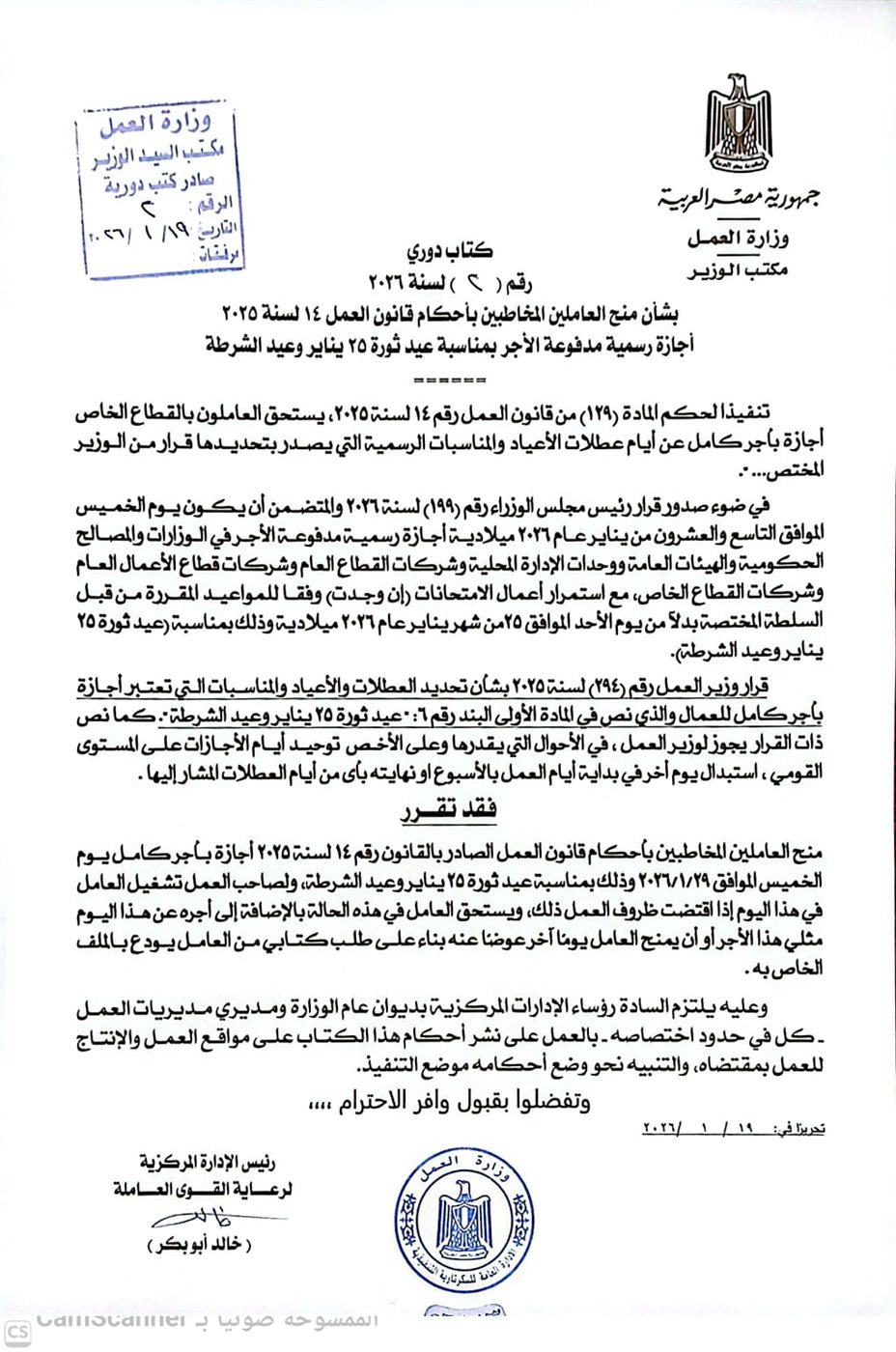 أعلن وزير العمل، محمد جبران، اليوم الثلاثاء، عن صدور الكتاب الدوري رقم (2) لسنة 2026 عن الوزارة، بشأن منح العاملين بالقطاع الخاص المخاطبين بأحكام قانون العمل رقم 14 لسنة 2025 إجازة رسمية مدفوعة الأجر، وذلك بمناسبة عيد ثورة 25 يناير وعيد الشرطة.