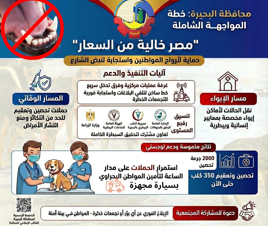 وأصدر المكتب الإعلامي لمحافظة البحيرة انفوجرافًا يوضح تفاصيل الخطة وآليات تنفيذها على أرض الواقع، والتي تهدف إلى الحد من تزايد أعداد الكلاب الضالة والسيطرة على الظاهرة بشكل كامل، ووفقا للانفوجراف فإن آليات التنفيذ على أرض الواقع تشمل تفعيل غرفة عمليات مركزية لمتابعة كافة التطورات، وتجهيز فرق للطوارئ والتدخل السريع في مختلف أنحاء المحافظة، وتخصيص خط ساخن لتلقي بلاغات المواطنين لضمان الاستجابة الفورية لأي تجمعات خطرة.