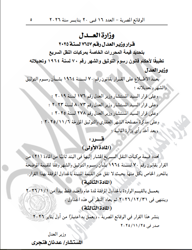 نشرت جريدة الوقائع المصرية، في عددها رقم 16، الصادر في 20 يناير 2026، قرار وزير العدل رقم 7657 لسنة 2025، بشأن تحديد قيمة الرسوم الخاصة بتوثيق وشهر مركبات النقل السريع، تطبيقًا لأحكام قانون رسوم التوثيق والشهر رقم 70 لسنة ١٩٦٤ وتعديلاته.