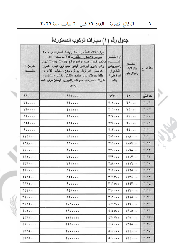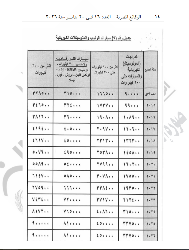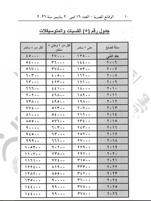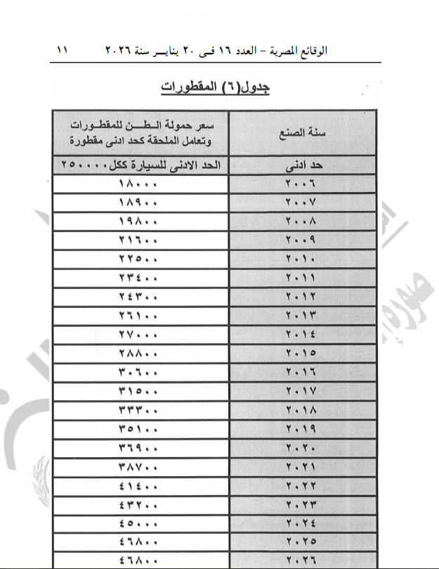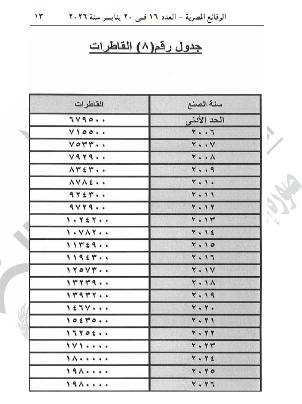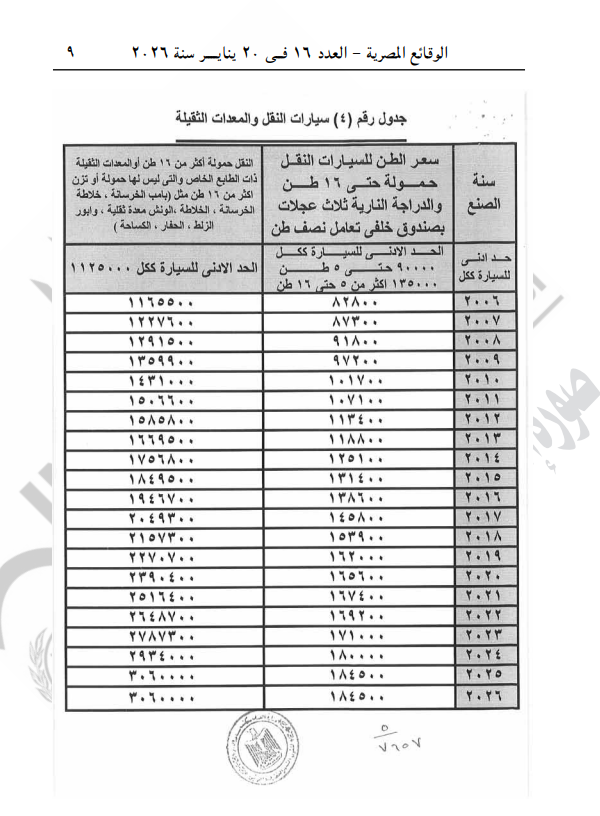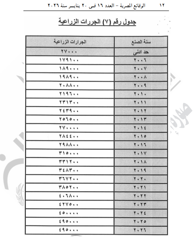 ويعمل بالقيم الواردة بالجداول المرفقة لمدة عام واحد فقط يبدأ من ٢٠٢٦/١/١ وينتهي في 31-12-2026 ثم يعاد النظر في هذه الجداول.