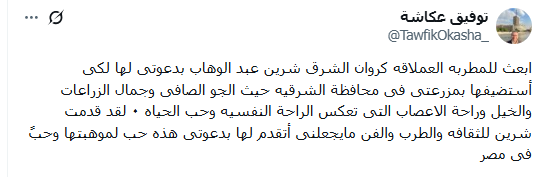 وقال توفيق عكاشة، عبر منصة "أكس"، في رسالته الثانية التي وجهها للمطربة شيرين عبد الوهاب: "أبعث للمطربة العملاقة كروان الشرق شيرين عبد الوهاب بدعوتى لها، لكي أستضيفها بمزرعتي في محافظة الشرقية، حيث الجو الصافي وجمال الزراعات والخيل وراحة الأعصاب التي تعكس الراحة النفسية وحب الحياة".