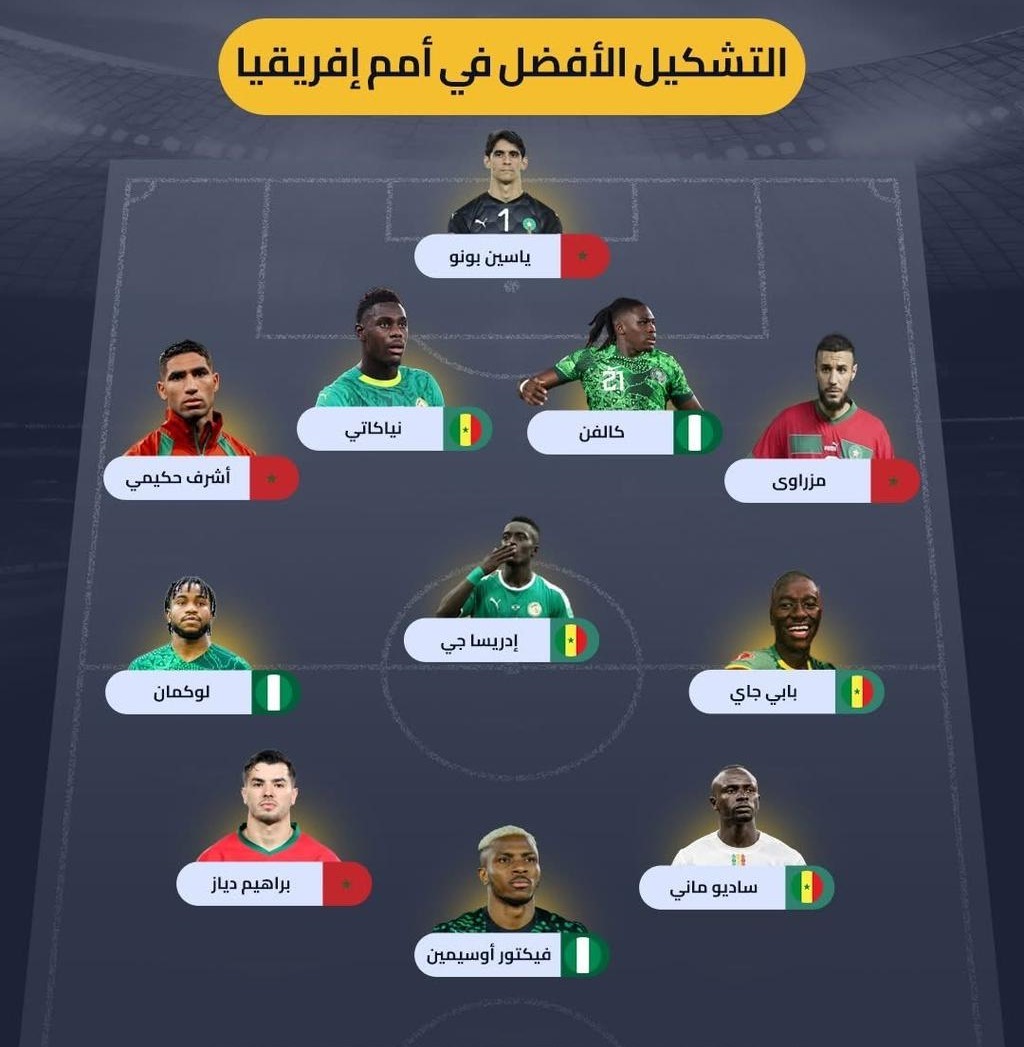 وتواجد 4 لاعبين من منتخبي السنغال والمغرب، و3 لاعبين من منتخب نيجيريا في التشكيل المثالي لكأس أمم أفريقيا 2025.