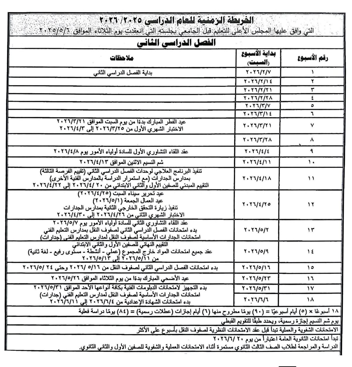 أعلنت وزارة التربية والتعليم والتعليم الفني، الخريطة الزمنية المعتمدة للعام الدراسي 2025/ 2026، وذلك بعد موافقة المجلس الأعلى للتعليم قبل الجامعي، متضمنة مواعيد بدء الفصل الدراسي الثاني، والإجازات الرسمية، وجدول الامتحانات لمختلف المراحل التعليمية.