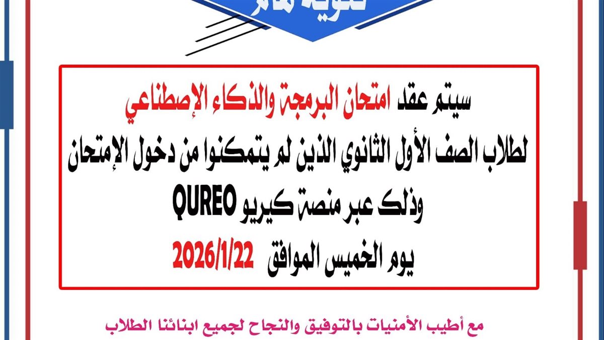 أعلنت مديرية التربية والتعليم بالقاهرة برعاية الدكتورة همت إسماعيل أبو كيلة، عقد امتحان البرمجة والذكاء الاصطناعي لطلاب الصف الأول الثانوي الذين لم يتمكنوا من دخول الامتحان وذلك غدا الخميس، عبر منصة QUREO.
