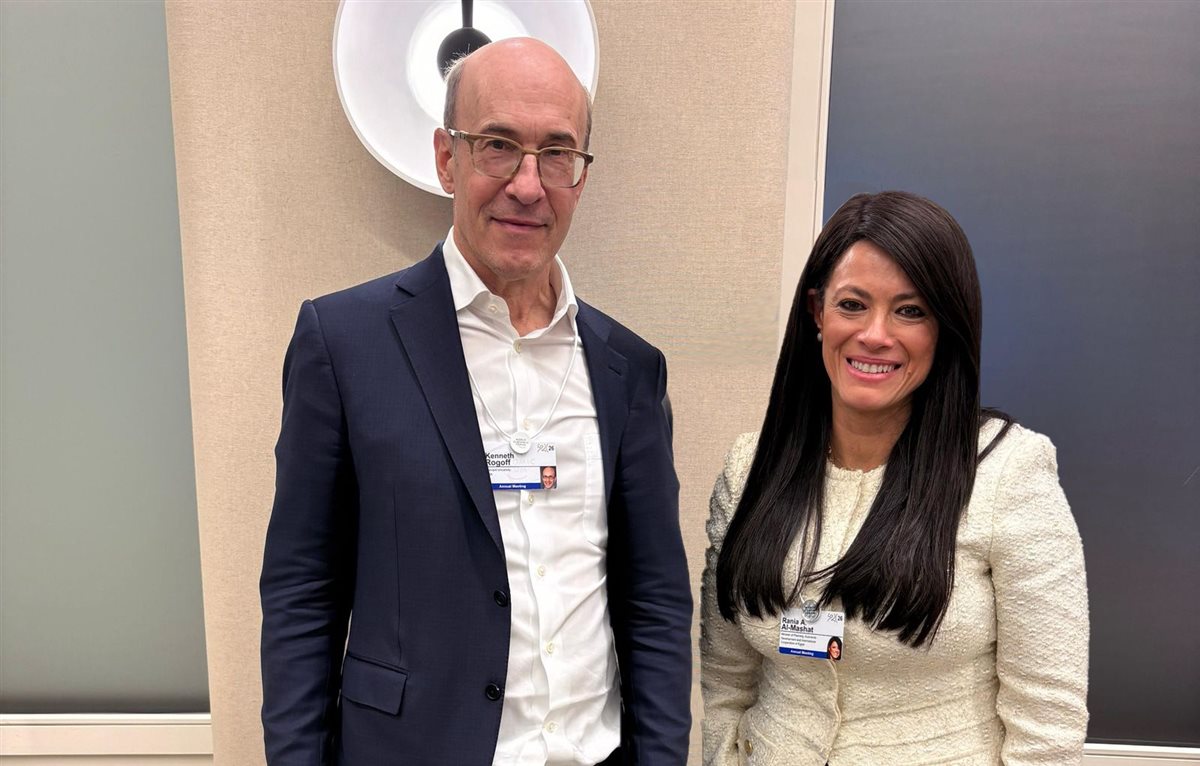 كما التقت الدكتورة رانيا المشاط، البروفيسور كينيث روجوف، أستاذ الاقتصاد بجامعة هارفارد وكبير الاقتصاديين السابق بصندوق النقد الدولي، لتناول التطورات الاقتصادية العالمية وقضايا الدين والاستقرار المالي، وأبرز التحديات التي تواجه الاقتصادات الناشئة، حيث ناقش الجانبان التحديات العالمية التي سيطرت على نقاشات المنتدى الاقتصادي العالمي، والحاجة إلى تعاون دولي أقوى لمواجهة تلك التحديات.