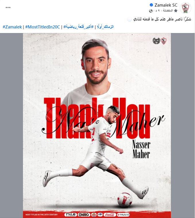 ونشرت الصفحة الرسمية لنادي الزمالك صورة لـ ناصر ماهر بقميص القلعة البيضاء وعلقت: “شكرًا ناصر ماهر على كل ما قدمته للنادي”.