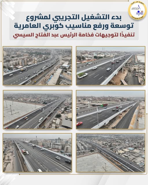 أعلنت وزارة النقل أنه اعتبارًا من اليوم الخميس 22/1/2026، سيفتح كوبري العامرية أمام حركة المرور، بعد الانتهاء من أعمال توسعة ورفع مناسيب الكوبري الذي يبلغ طوله 1200 متر بواقع 5 حارات في كل اتجاه.