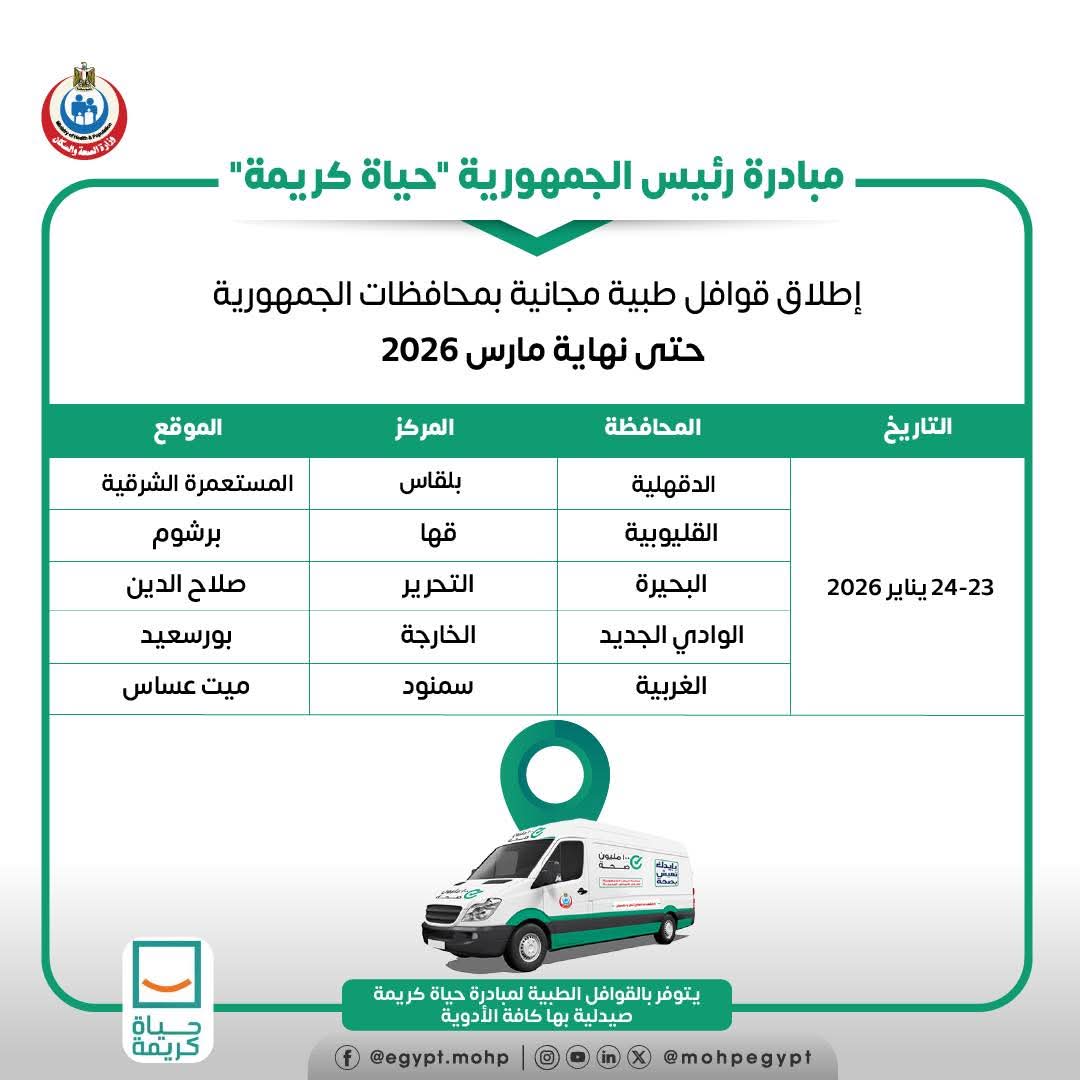 وتنطلق القوافل الطبية يومي 23 و24 يناير 2026، لتقديم خدمات الفحص والكشف والعلاج المجاني للمواطنين في عدد من المناطق، على النحو التالي:
