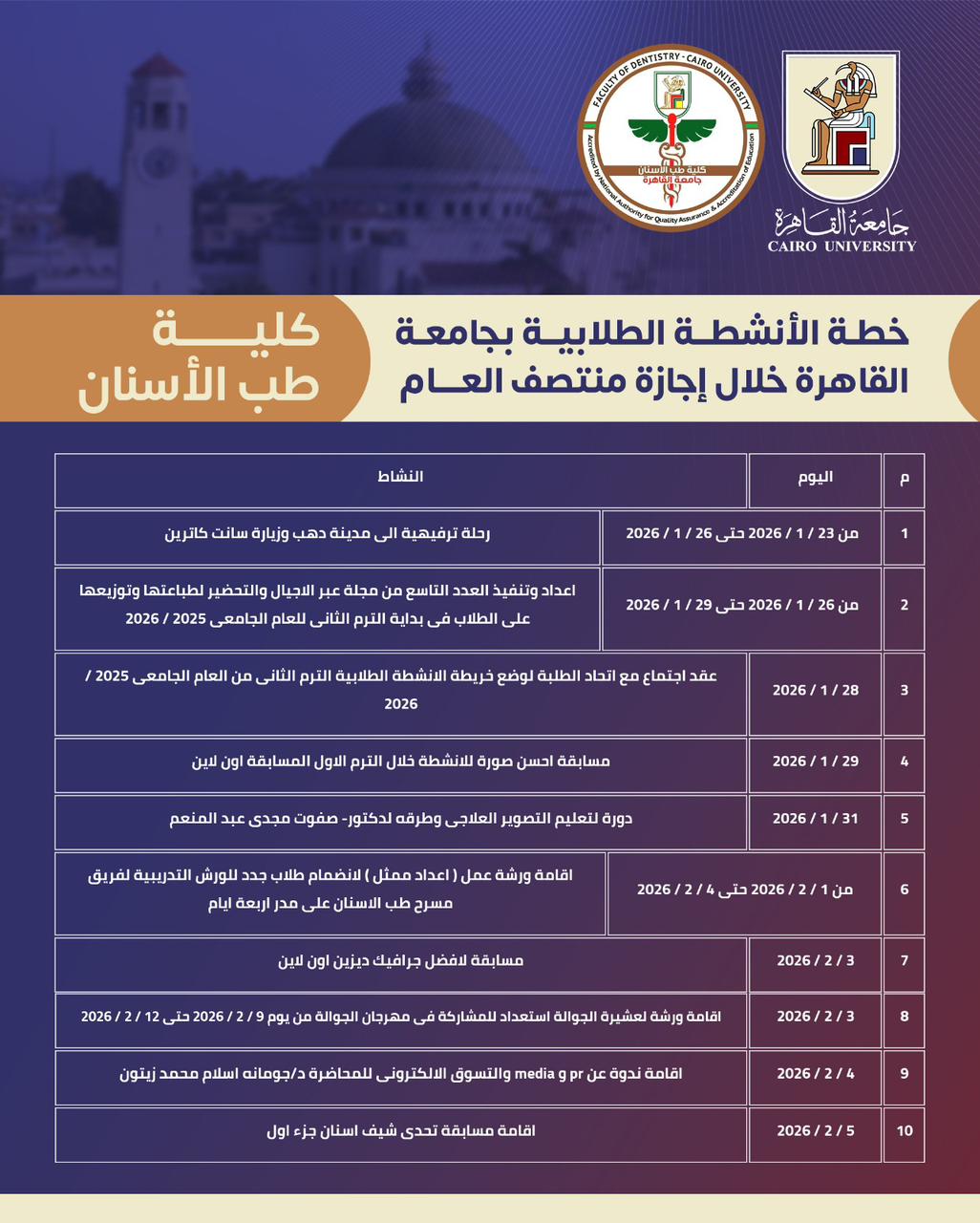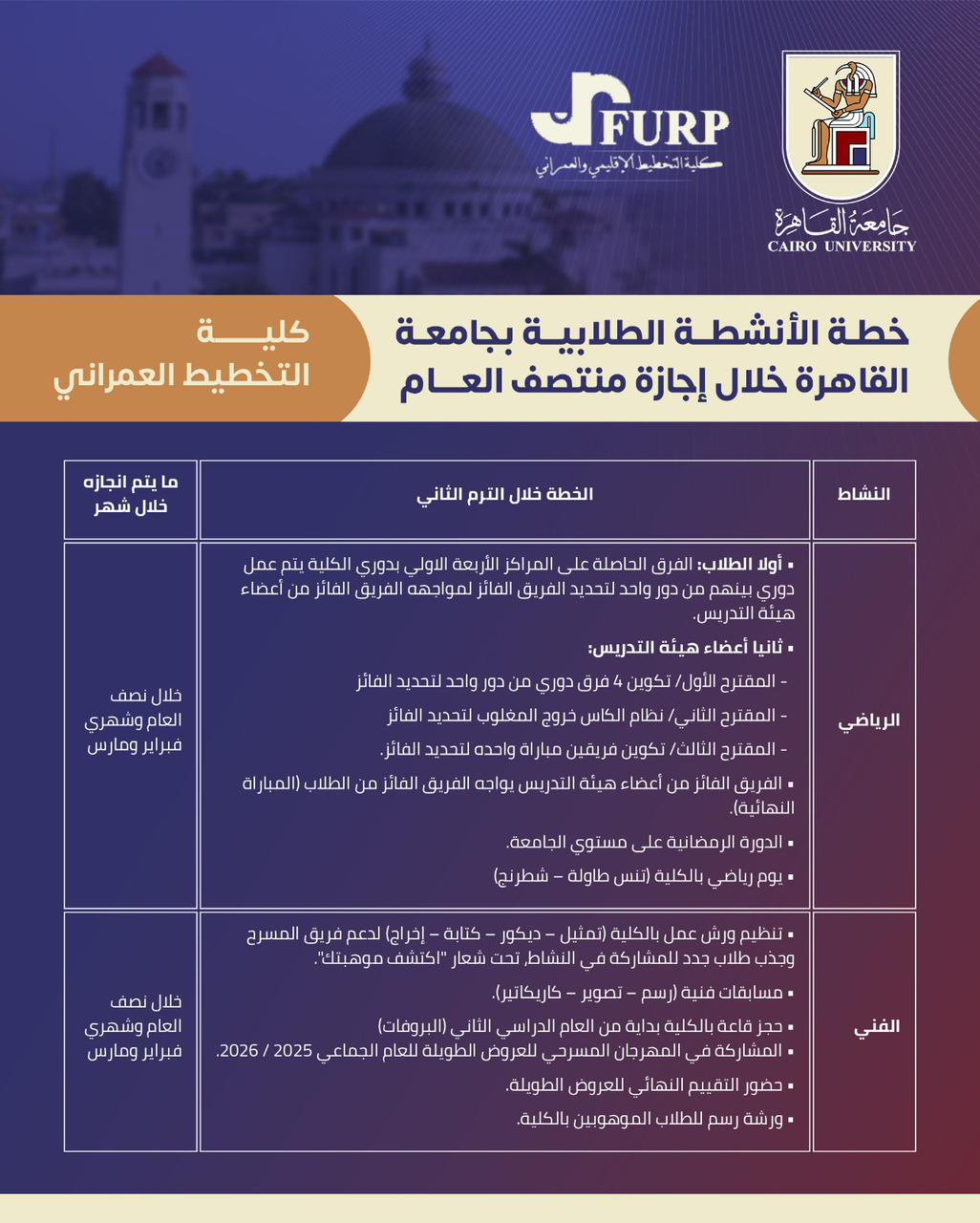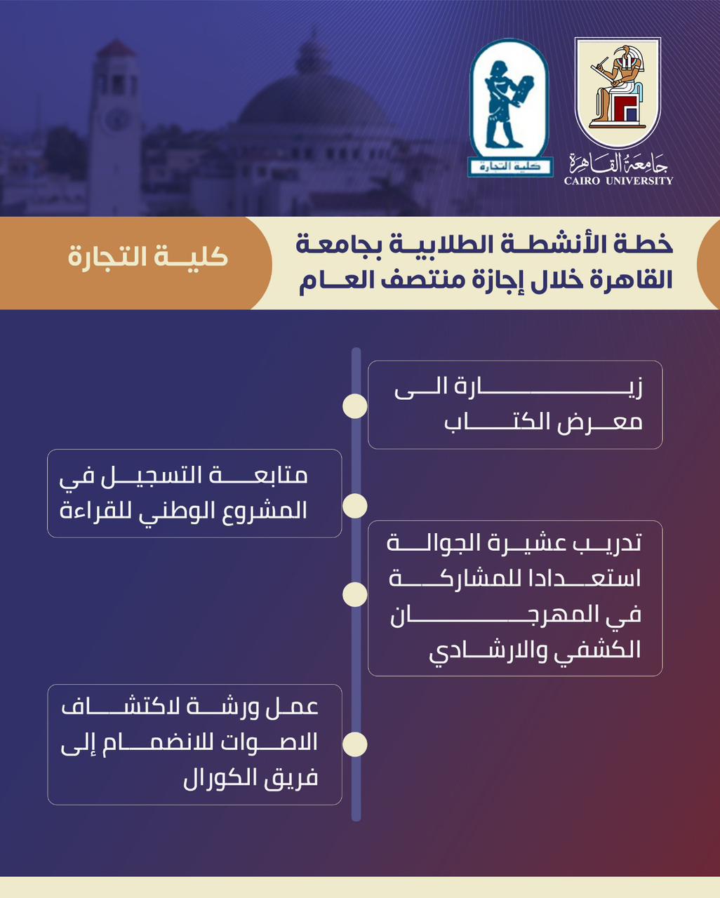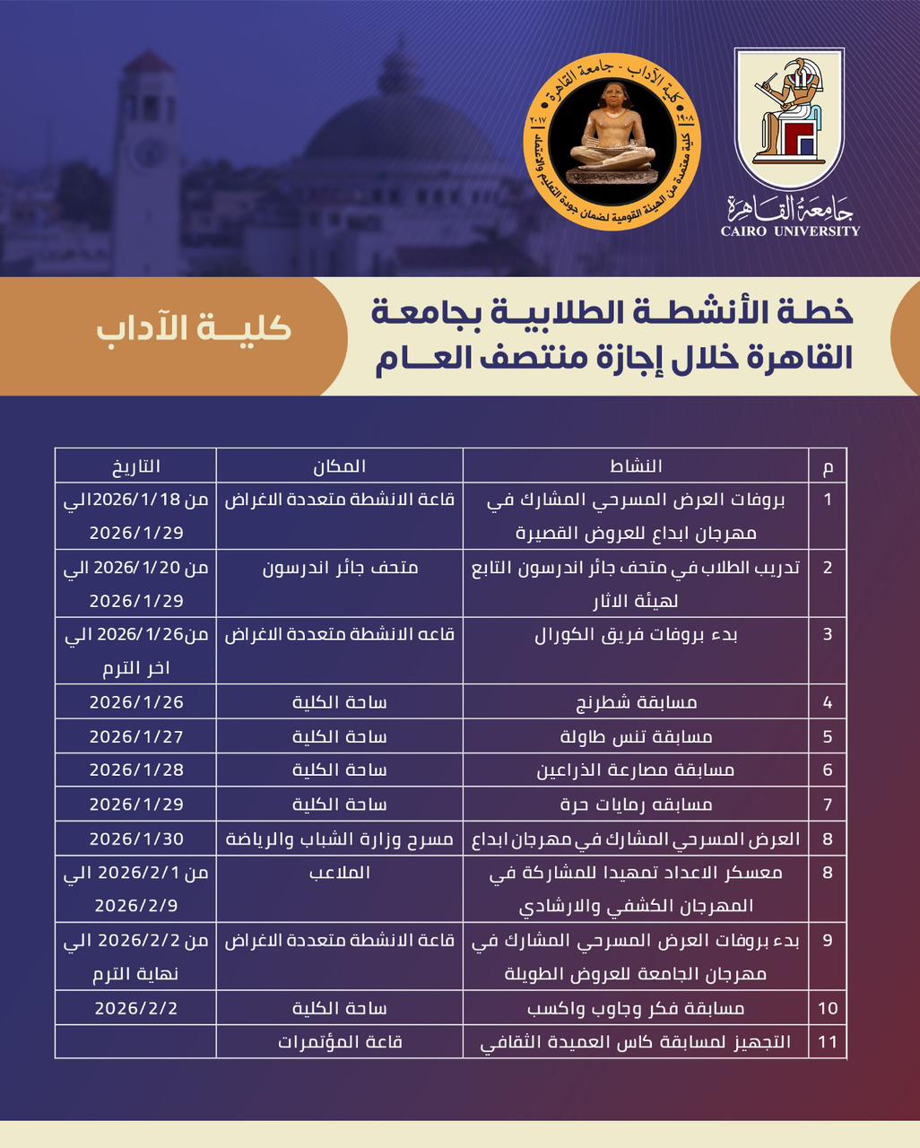 جامعة القاهرة تعلن جداول الأنشطة الطلابية خلال إجازة منتصف العام الدراسي