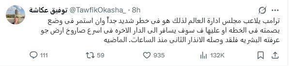 وقال توفيق عكاشه من خلال تغريدة علي موقع التواصل الاجتماعي (إكس): "ترامب يلاعب مجلس إدارة العالم.. لذلك هو فى خطر شديد جدًا فلقد وصله الإنذار الثانى في الساعات الماضيه".