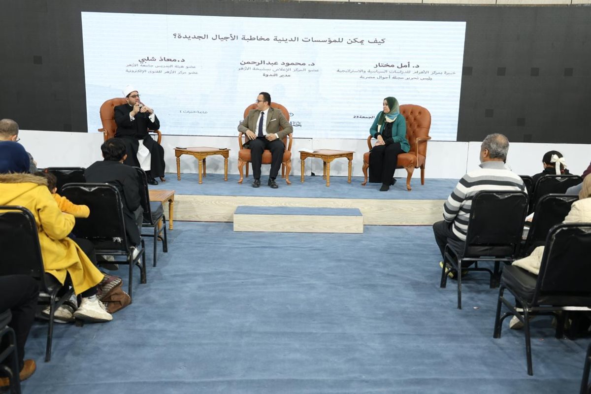 عقد جناح الأزهر الشريف بمعرض القاهرة الدولي للكتاب في دورته السابعة والخمسين، اليوم الجمعة، ندوة بعنوان: "كيف يمكن للمؤسسات الدينية مخاطبة الأجيال الجديدة؟"، حاضر فيها الدكتورة أمل مختار، الخبيرة بمركز الأهرام للدراسات السياسية والاستراتيجية، الدكتورمعاذ شلبي، عضو مركز الأزهر للفتوى الإلكترونية، وأدار الندوة محمود عبدالرحمن، عضو المركز الإعلامي للأزهر, بحضور الدكتور محمد الضويني، وكيل الأزهر، الدكتور محمد الجندي، الأمين العام لمجمع البحوث الإسلامية، والشيخ أيمن عبد الغني، رئيس قطاع المعاهد الأزهرية.