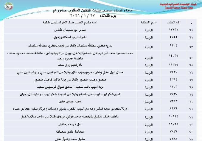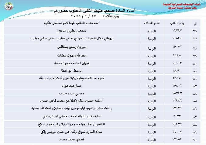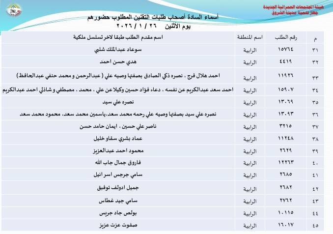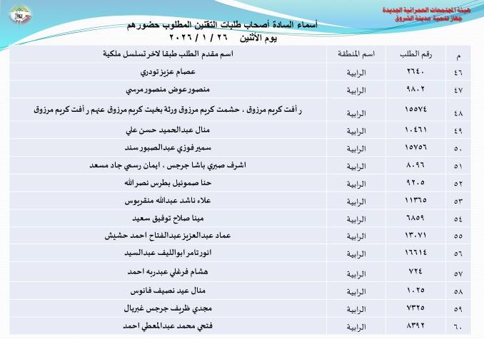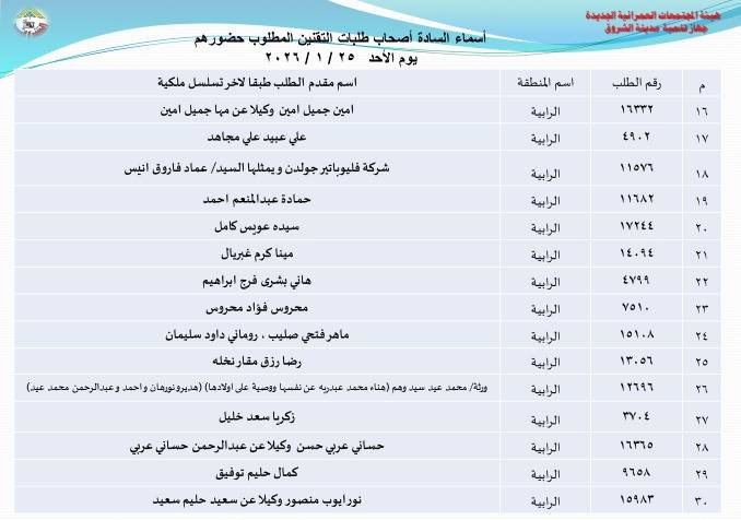 أعلنت هيئة المجتمعات العمرانية بوزارة الإسكان، أسماء دفعة جديدة من أصحاب طلبات تقنين أراضيهم بتوسعات مدينة الشروق، وطالبتهم بالحضور إلى مقر جهاز المدينة لاستكمال إجراءات التقنين، وذلك بداية من غد الأحد 25 يناير الجاري.