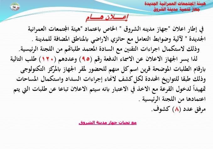 وأشار جهاز مدينة الشروق إلى أنه في إطار اهتمام الهيئة بآلية وضوابط التعامل مع حائزي الأراضي بالمناطق المضافة للمدينة، يتم استقبال المواطنين أصحاب الطلبات لاستكمال إجراءات التقنين المعتمدة طلباتهم من اللجنة الرئيسية للتقنين.