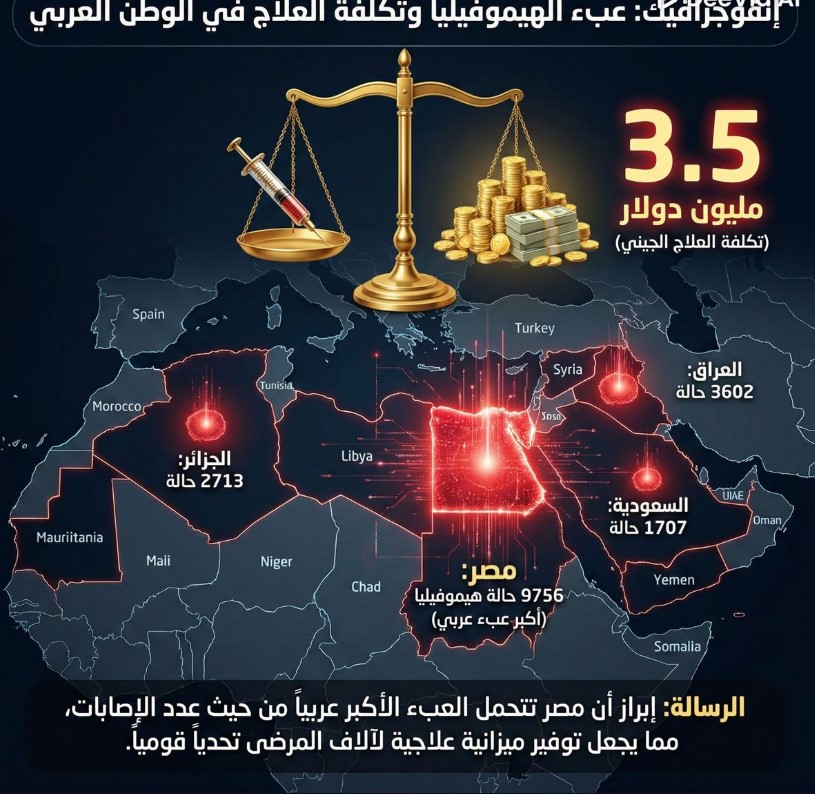 وفقًا لـ "المسح العالمي السنوي 2024" الصادر عن الاتحاد العالمي للهيموفيليا في أكتوبر 2025، فإن العالم يضم أكثر من 459 ألف مريض مشخص، وفي هذا المشهد، تبرز مصر كواحدة من أعلى الدول العربية من حيث عدد الإصابات المسجلة.