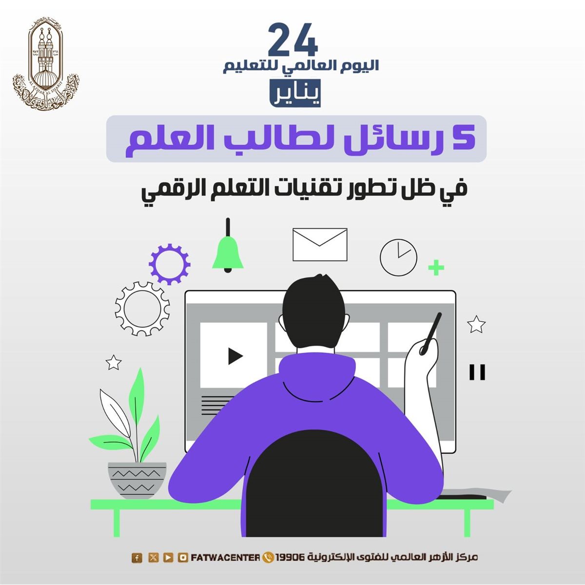 حرص مركز الأزهر العالمي للفتوى الإلكترونية على توجيه 5 رسائل لطالب العلم في ظل تطور تقنيات التعلم الرقمي، وذلك بالتزامن مع اليوم العالمي للتعليم.