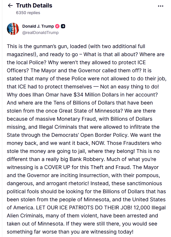 وقال "لا يمكن الوثوق بالحكومة الفدرالية"، ليوجّه بعد ذلك انتقادات حادة لإدارة الهجرة والجمارك التي اعتبر أنها "تبث الفوضى والعنف".