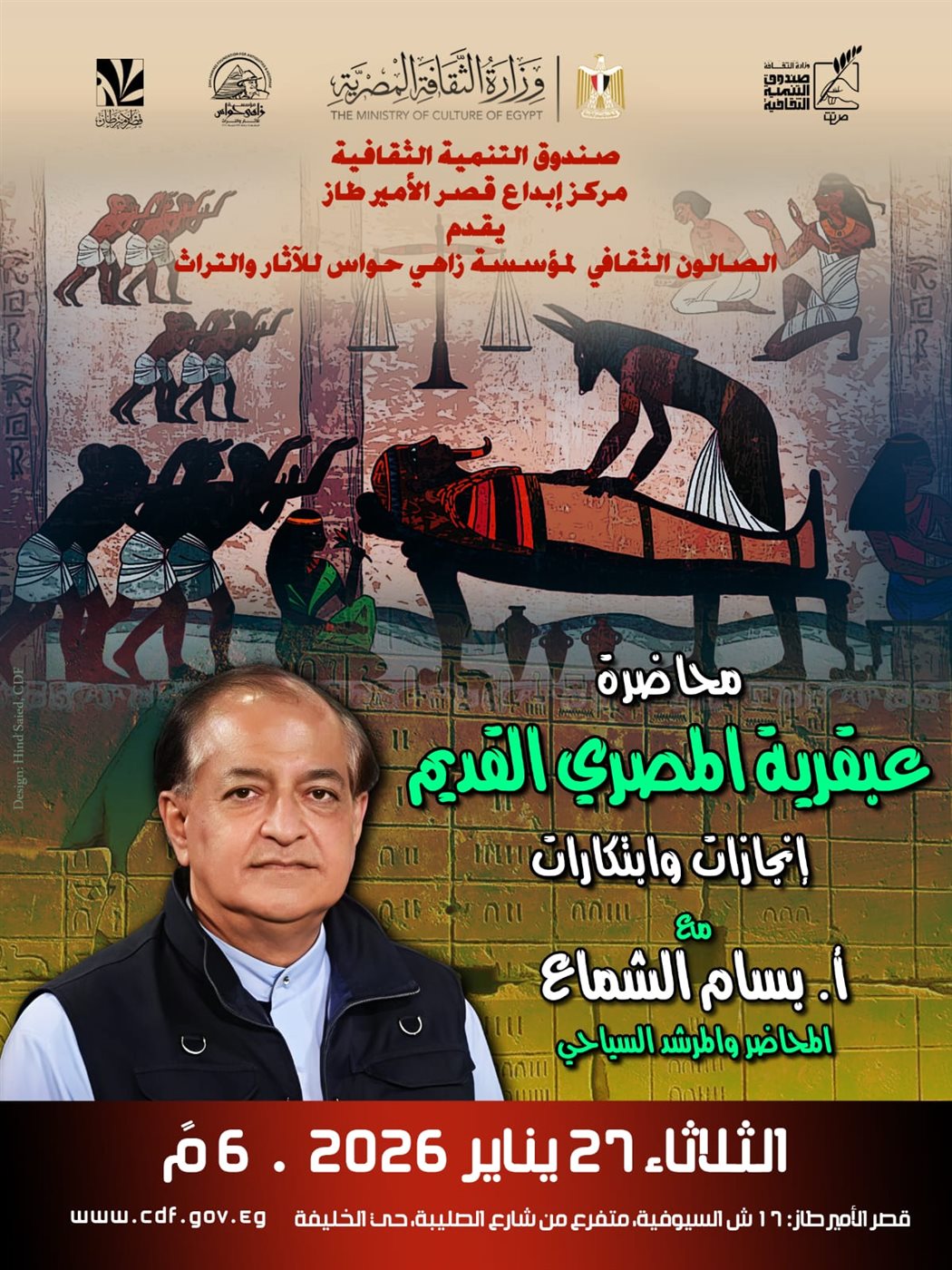 ينظم مركز إبداع قصر الأمير طاز بشارع السيوفية، التابع لقطاع صندوق التنمية الثقافية، بالتعاون مع مؤسسة زاهي حواس للآثار والتراث، ندوة ثقافية تحت عنوان "عبقرية المصري القديم: إنجازات وابتكارات"، وذلك يوم الثلاثاء المقبل الموافق 27 يناير في تمام الساعة السادسة مساءً.