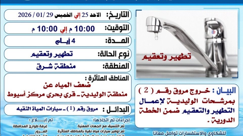 وأوضحت شركة مياه أسيوط أن أعمال الصيانة ستبدأ من الساعة العاشرة مساءً يوم الأحد الموافق 25 يناير 2026، وتستمر حتى العاشرة مساء يوم الخميس الموافق 29 يناير 2026، مما قد يؤدي إلى ضعف المياه بالأدوار العليا خاصة خلال أوقات الذروة، وذلك بمنطقة شرق الوليدية وبعض قرى بحري مركز أسيوط وهي: (منقباد ــ نجع سبع ــ بني حسين)، وذلك بهدف تحسين جودة المياه المقدمة للمواطنين.