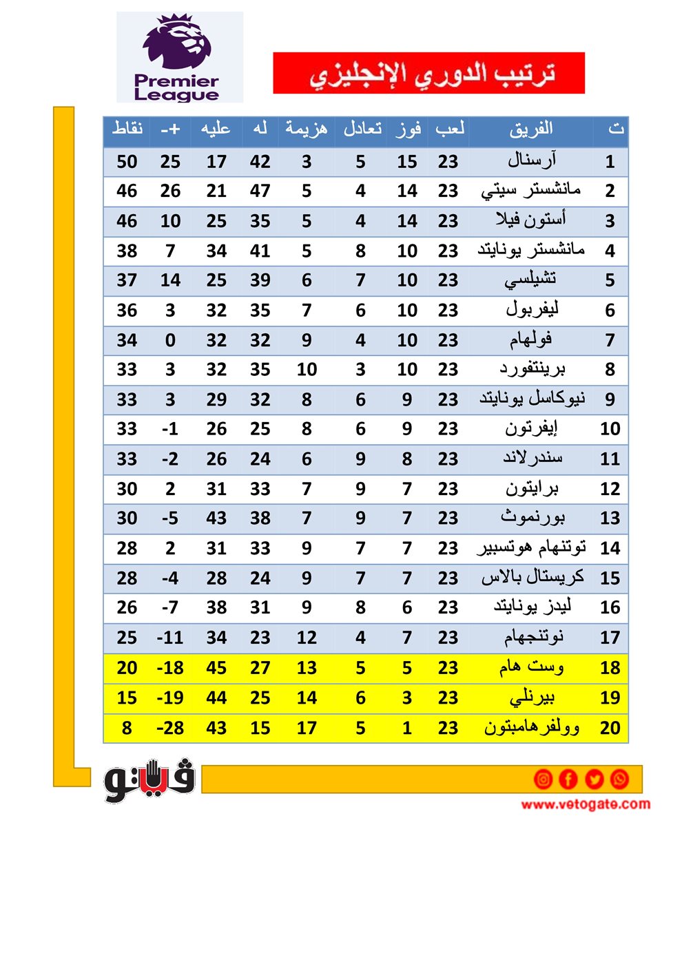 ترتيب الدوري الإنجليزي بعد الجولة الـ 23