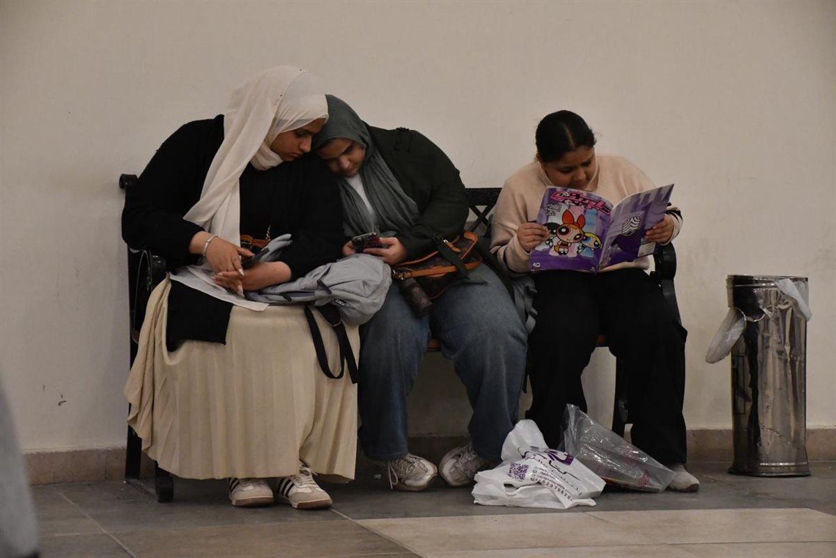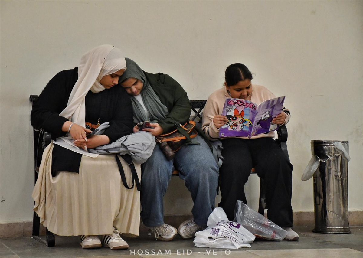 وعلى النقيض تمامًا، وفي كادر الصورة نفسه، كانت تجلس فتاتان من "جيل الشاشات"، غارقتين في عوالم افتراضية عبر هواتفهما الذكية، في مشهد يعكس بوضوح كيف تسرق مواقع التواصل الاجتماعي أعمار الشباب وتهدر طاقاتهم فيما لا ينفع، بينما تظل القراءة هي الملاذ الأخير للمعرفة والعلم وبناء الذات.