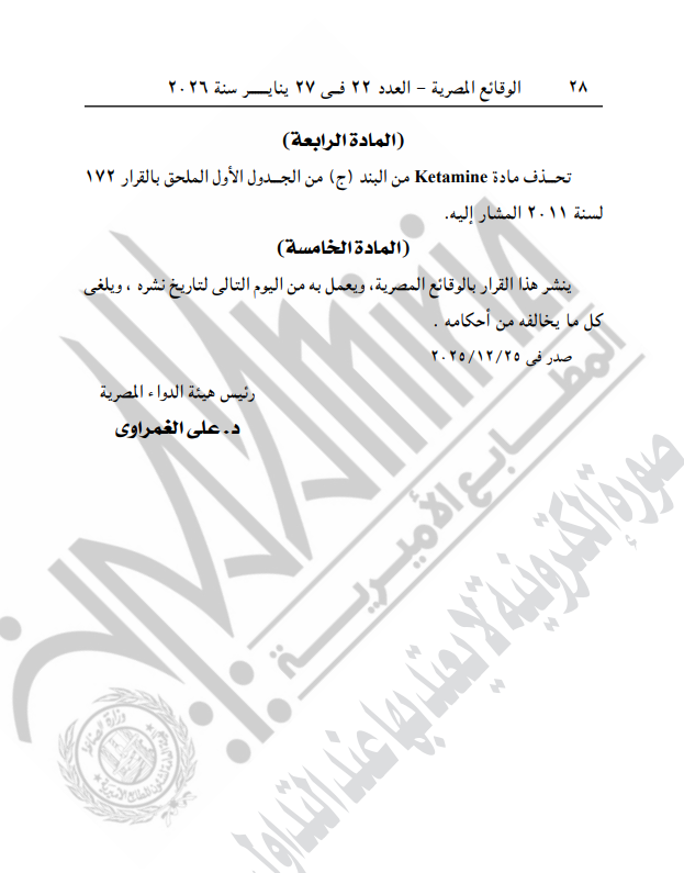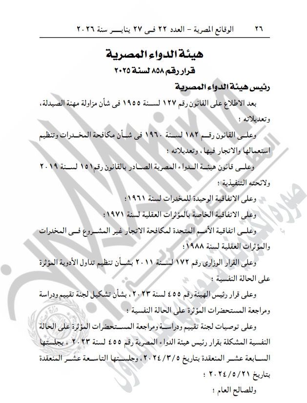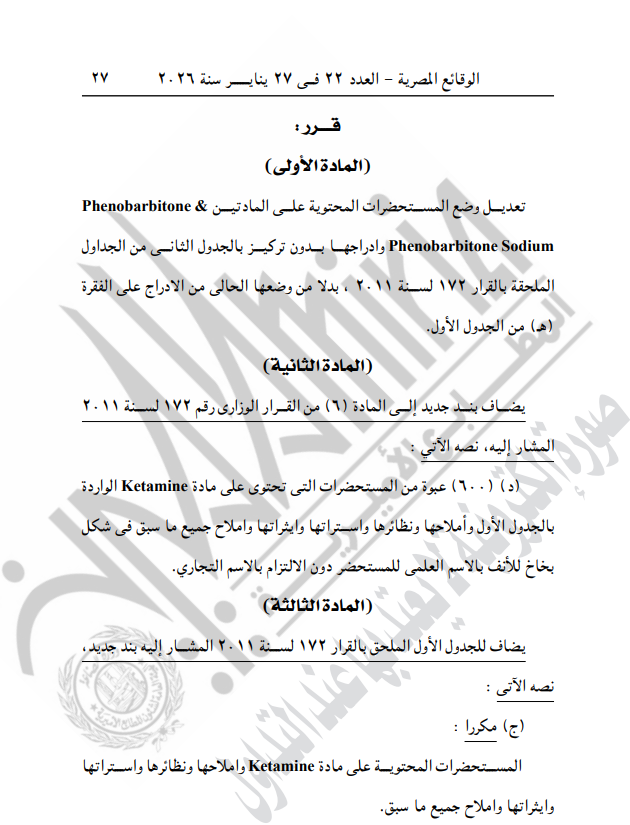 نشرت جريدة الوقائع المصرية في عددها رقم 22، الصادر 27 يناير 2026، قرار هيئة الدواء المصرية رقم 858 لسنة 2025، بشأن إدراج دواء الـ (فينوباربيتال) في جدول المواد المخدرة.