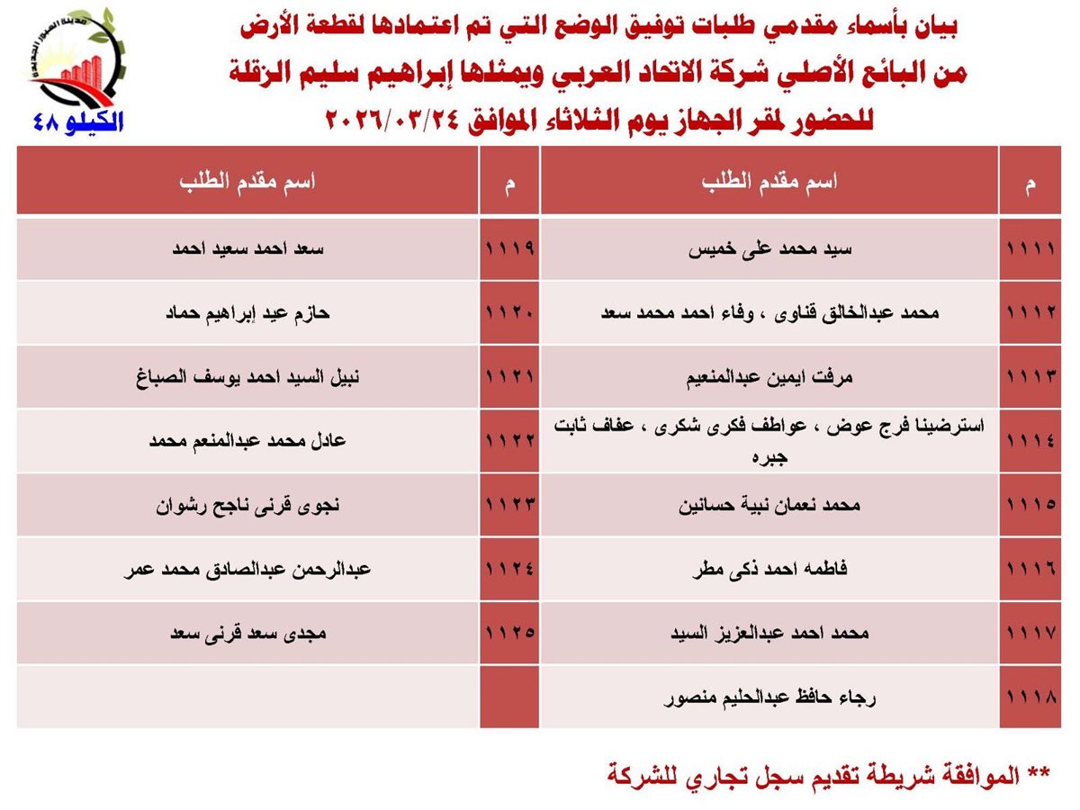 وناشد جهاز مدينة العبور الجديدة المواطنين بمراجعة الجهاز لاستكمال الإجراءات والسداد، علمًا بأنه سيتم التعامل مع صاحب الشأن بصفته، حيث سيتم التوقيع على الإقرارات اللازمة، وذلك بداية الأحد 22 مارس المقبل.