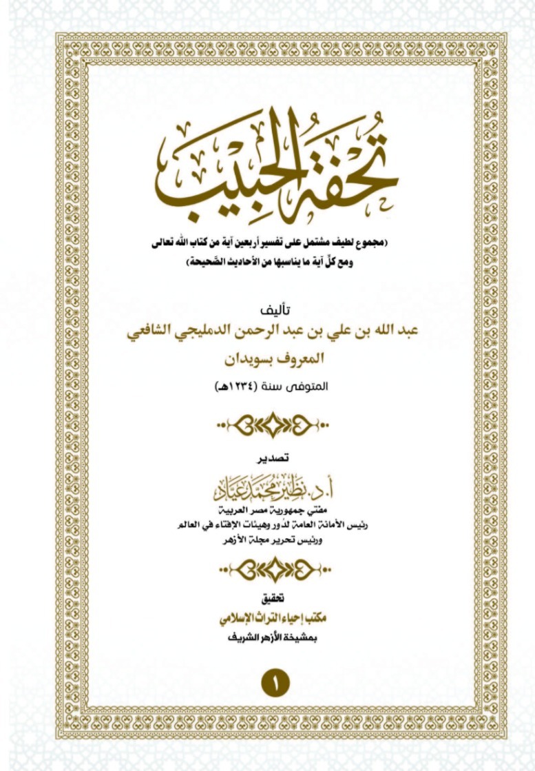 تقدم مجلة الأزهر في عددها الجديد لمتابعيها وقرائها هدية علمية فريدة بعنوان "تحفة الحبيب"، وهي مجموعة لطيفة من التفسيرات شاملة لأربعين آية من القرآن الكريم، مع ما يناسب كل آية من الأحاديث الصحيحة، تأليف الشيخ عبد الله بن علي بن عبد الرحمن الدمليجي الشافعي المعروف بسويدان، المتوفى سنة 1234هـ.