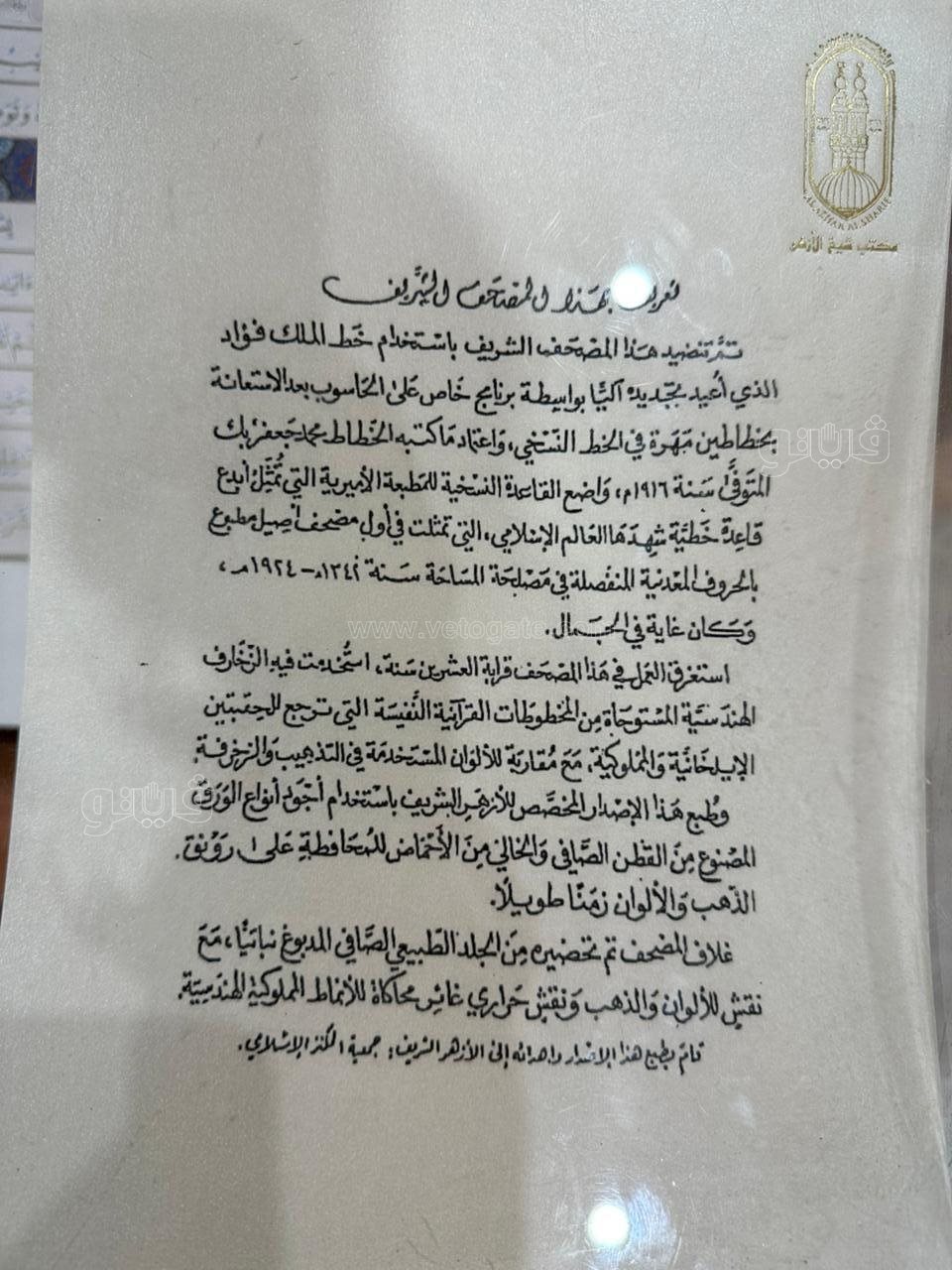 وتأتي هذه النسخة المعروضة في جناح الأزهر الشريف بمعرض القاهرة الدولي للكتاب، كاستكمال وتطوير لأول مصحف أصيل مطبوع بالحروف المعدنية المنفصلة، والذي صدر في مصلحة المساحة عام (1342هـ - 1924م).