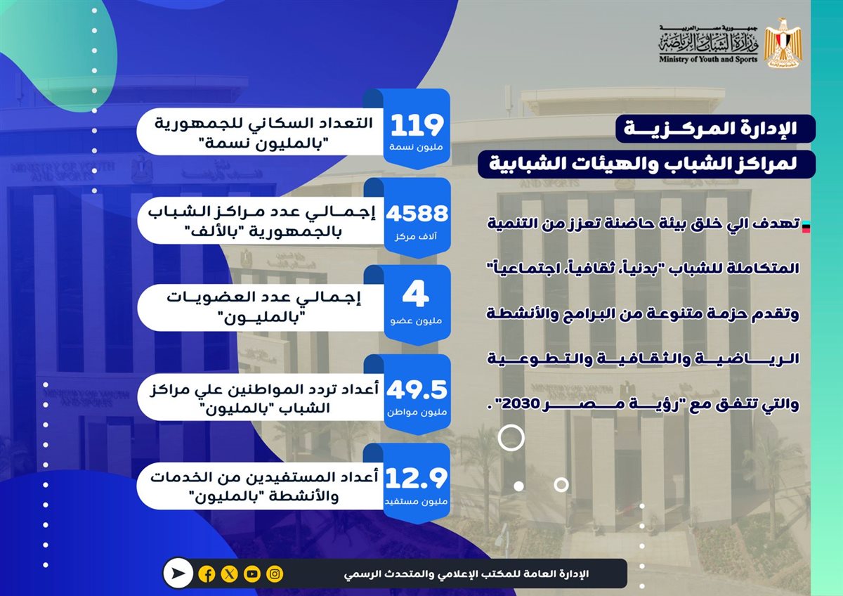 بالأرقام، مراكز الشباب تخدم 12.9 مليون عضو وتستقبل 49.5 مليون زيارة سنويًا