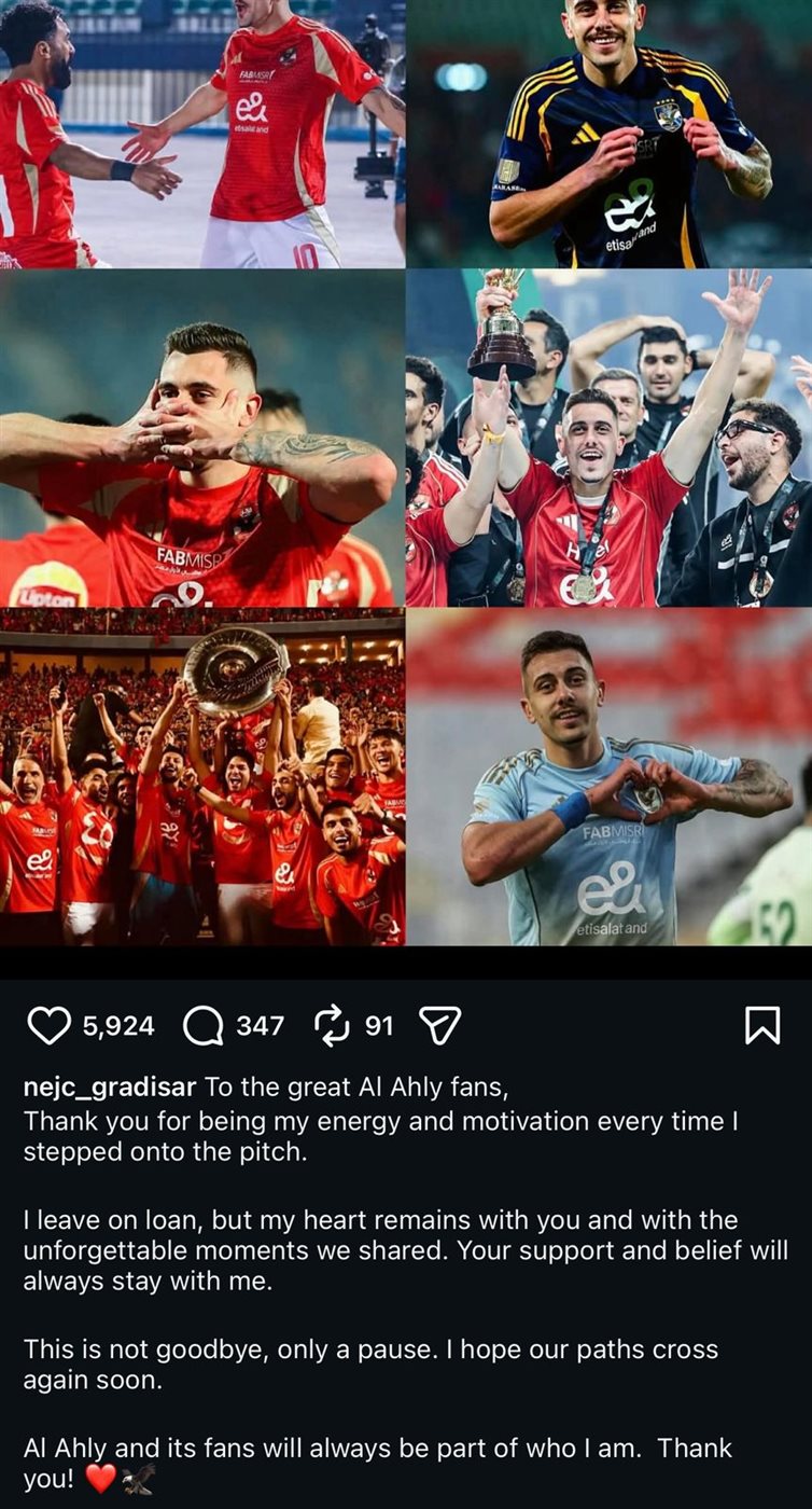 حرص السلوفيني نيتس جراديشار، مهاجم النادي الأهلي، على توجيه رسالة وداع مؤثرة إلى جماهير القلعة الحمراء، عقب الإعلان الرسمي عن رحيله من صفوف الفريق على سبيل الإعارة خلال فترة الانتقالات الحالية.