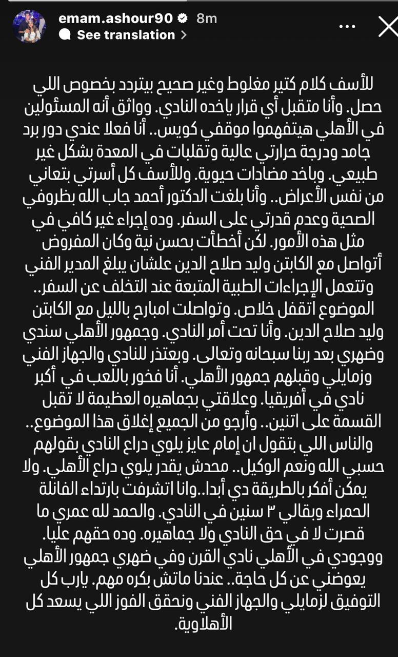 واعتذر إمام عاشور للنادي الأهلي وقال في بيان الاعتذار الذي نشره عبر حسابه الشخصي على منصة "إنستجرام": "للأسف هناك كلام كثير مغلوط وغير صحيح يتردد بخصوص ما حصل، وأنا متقبل أي قرار يتخذه النادي، وواثق أن المسؤولين في الأهلي سيتفهمون موقفي جيدًا".