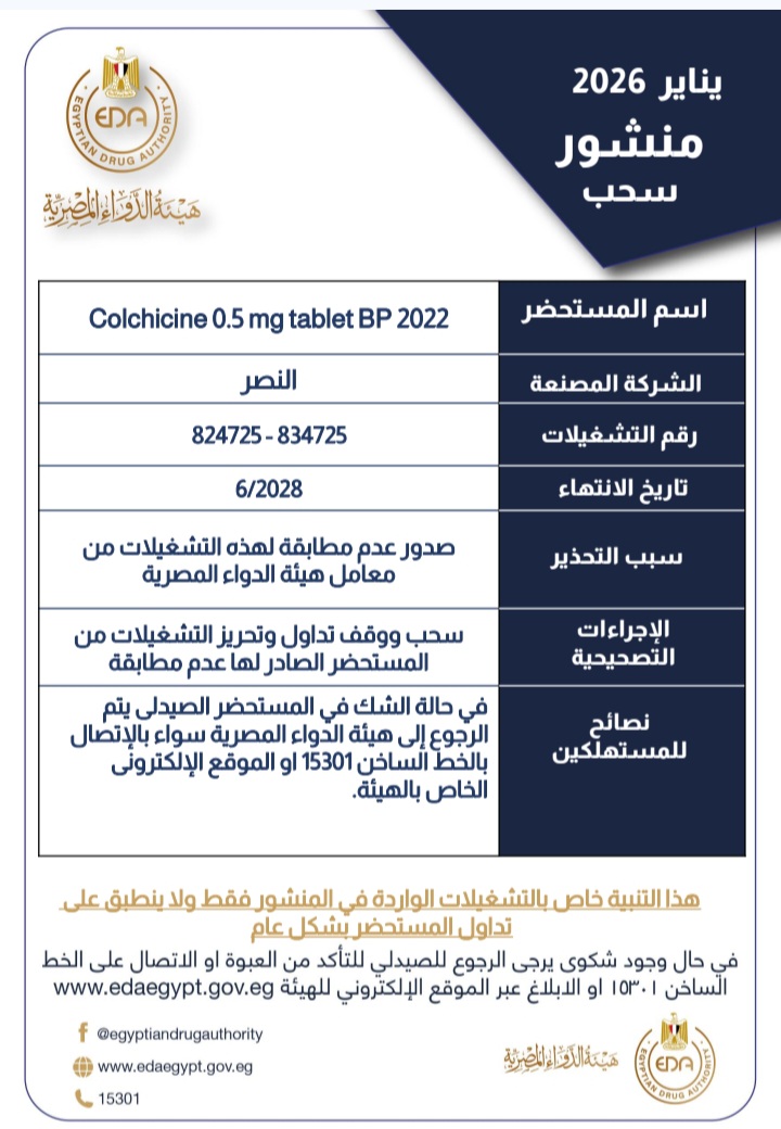 أعلنت هيئة الدواء المصرية، عن سحب عدد من تشغيلات دواء Colchicine 0.5 mg tablet BP 2022، وذلك بعد ثبوت عدم مطابقة هذه التشغيلات لمعامل الهيئة.