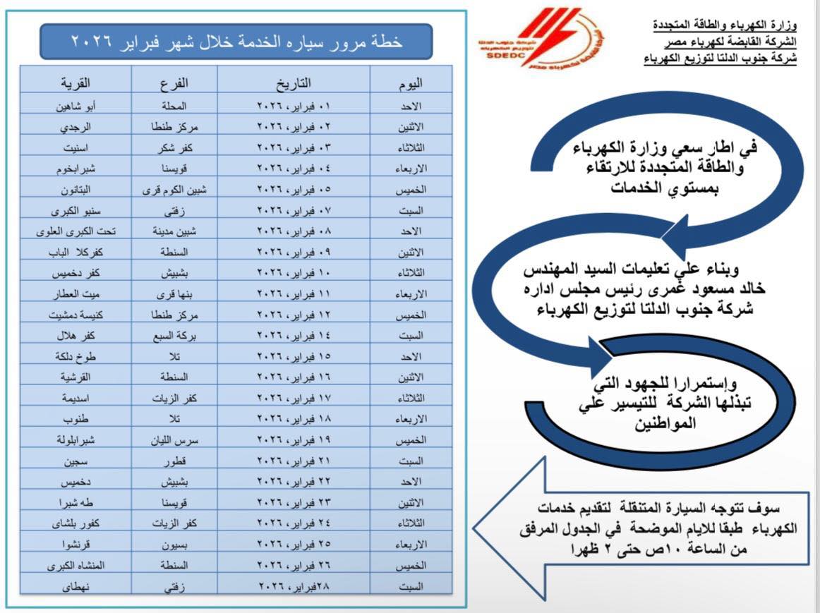 أعلنت شركة جنوب الدلتا لتوزيع الكهرباء برئاسة المهندس خالد مسعود غمري، خطوات تشغيل سيارة الخدمة المتنقلة لتقديم خدمات الكهرباء بنطاق شركة جنوب الدلتا لتوزيع الكهرباء خلال شهر فبراير ٢٠٢٦.