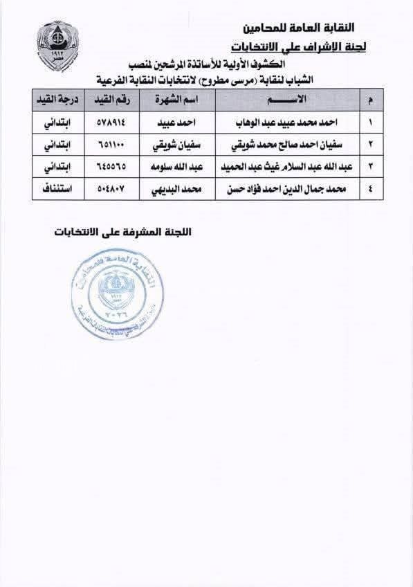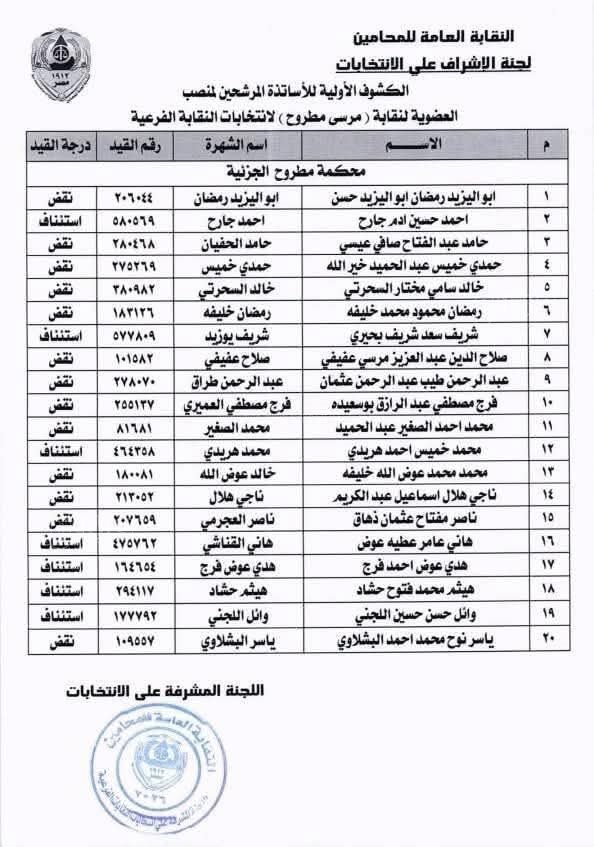 فيما ترشح لمنصب عضوية محافظة مطروح 20 محاميا وهم: