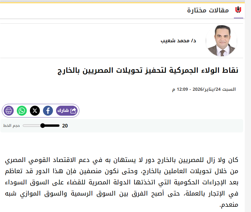 لمطالعة مقال الدكتور محمد شعيب بشأن تحفيز تحويلات المصريين بالخارج عبر الرابط التالي:.