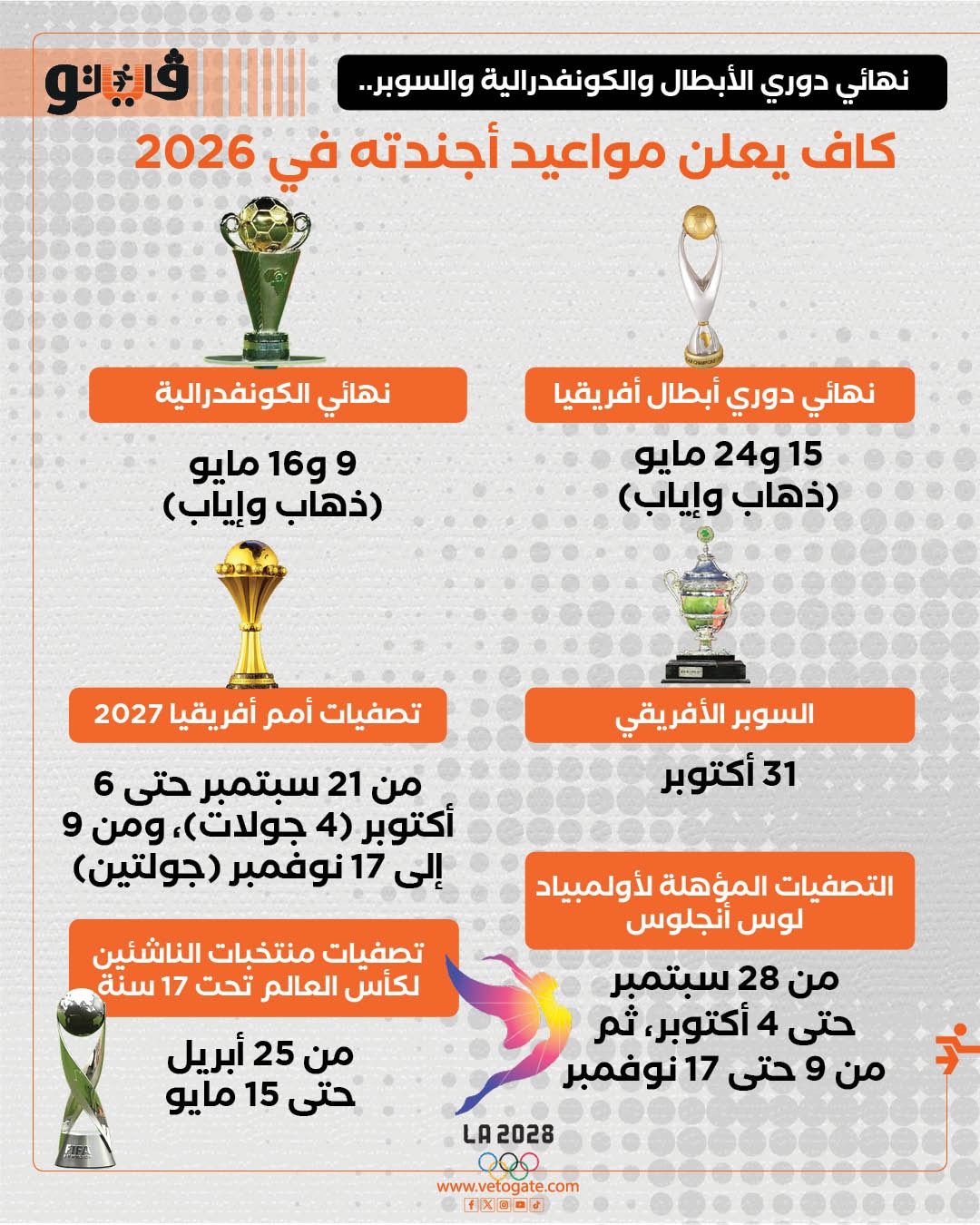 نهائي دوري الأبطال والكونفدرالية.. الكاف يحدد مواعيد أجندته في 2026 (إنفوجراف)