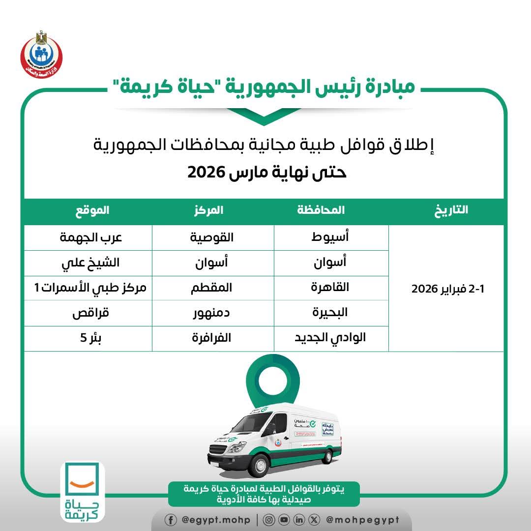 أعلنت وزارة الصحة عن خريطة القوافل الطبية المقرر إطلاقها بالمحافظات 1 و2 فبراير 2026، والتى شملت مناطق متفرقة بهدف تعزيز مستوى الخدمات الطبية المقدمة للمواطنين.