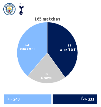 وفقا لموقع ترانسفير ماركت العالمي المختص في الإحصائيات جاءت أرقام مواجهات مانشستر سيتي وتوتنهام في جميع المسابقات كالتالي: