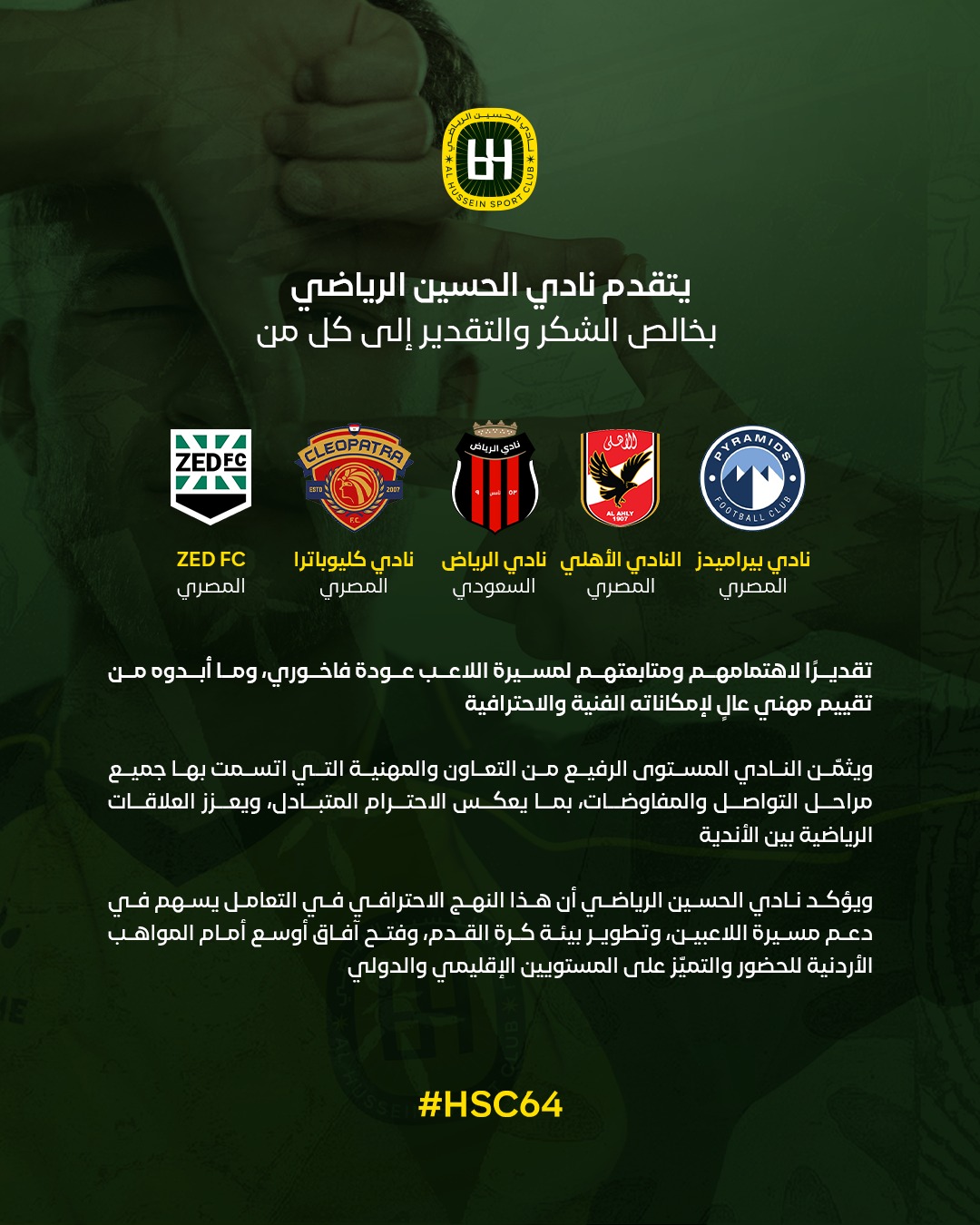 وتقدم نادي الحسين الرياضي ممثلًا برئيسه المهندس عامر أبو عبيد بخالص الشكر والتقدير إلى كل من: نادي بيراميدز المصري والنادي الأهلي المصري ونادي الرياض السعودي ونادي سيراميكا كليوباترا المصري ونادي ZED المصري تقديرًا لاهتمامهم ومتابعتهم لمسيرة لاعب النادي عودة فاخوري، وما أبدوه من تقييم مهني عالٍ لإمكاناته الفنية والاحترافية.