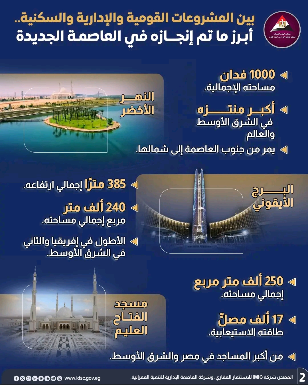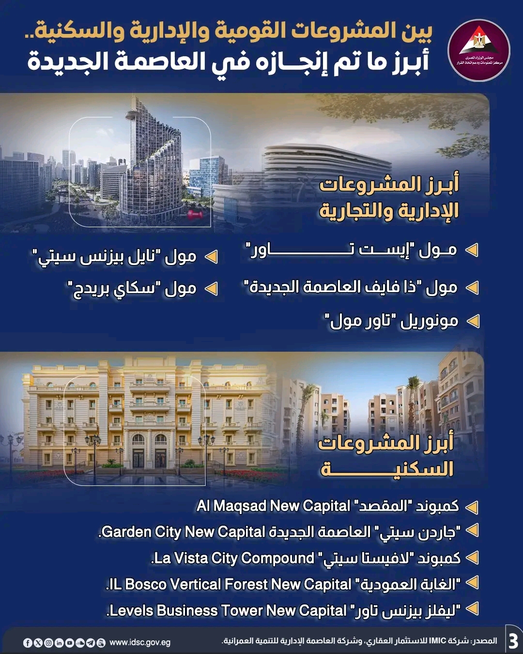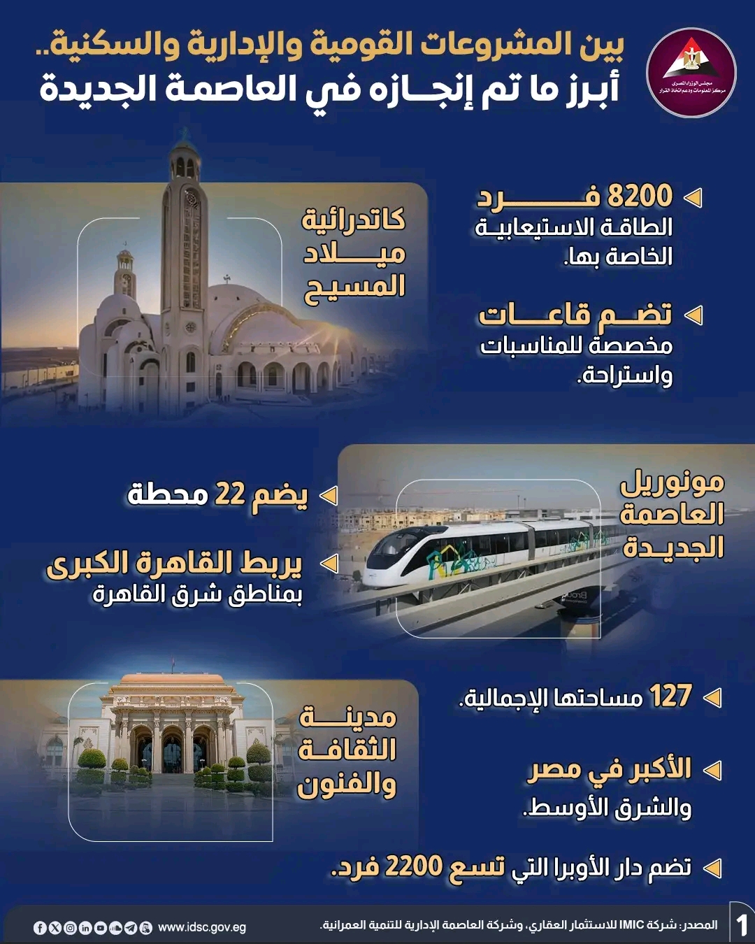 أصدر مركز المعلومات ودعم اتخاذ القرار التابع لمجلس الوزراء إنفو جراف عن المشروعات التي تم إنشاؤها بالعاصمة الجديدة.